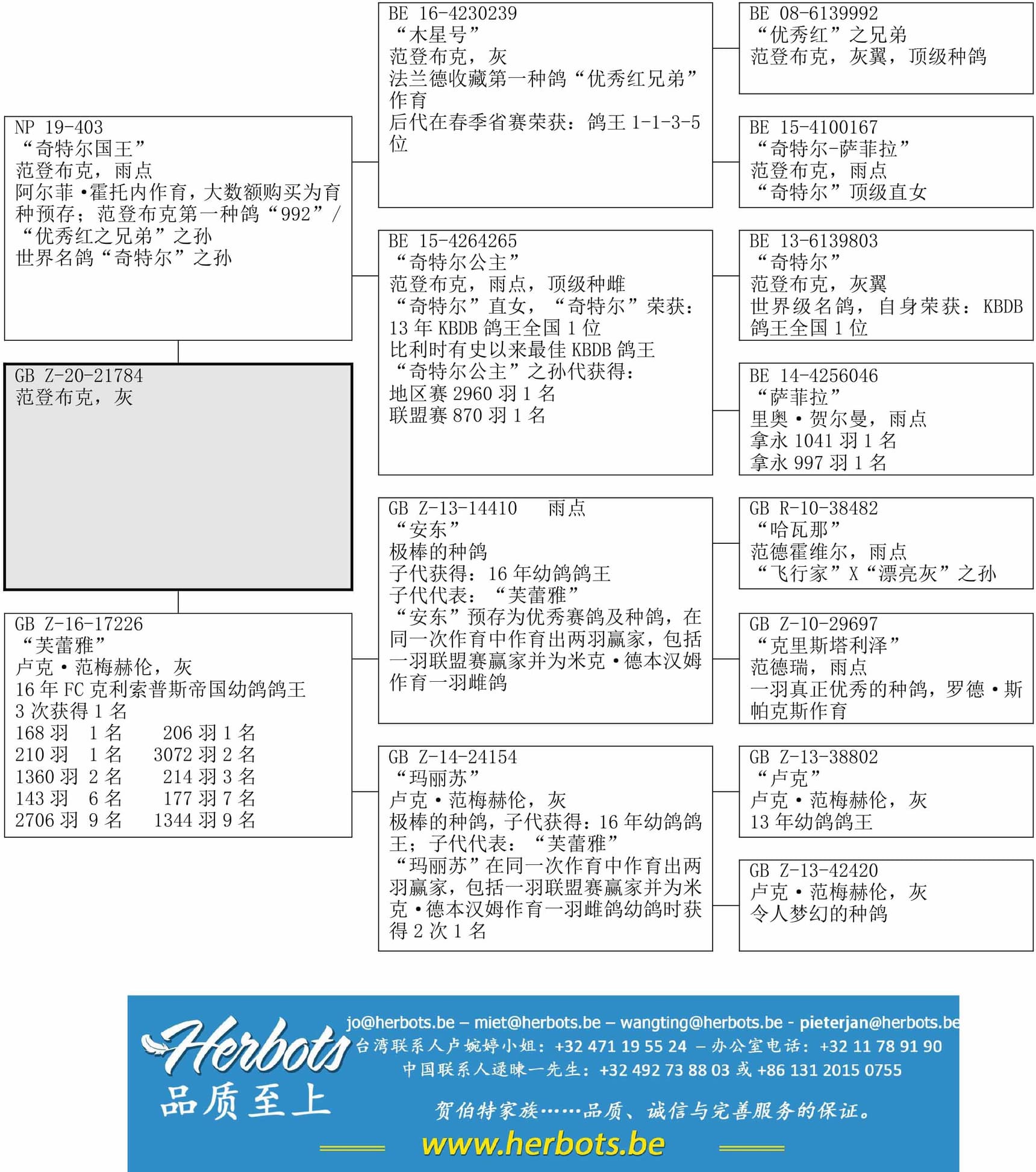 “芙蕾雅”作育,“芙蕾雅”荣获:16 年克利索普斯帝国飞行俱乐部幼鸽鸽王父亲:NP-C-19-403“奇特尔国王”—100%范登布克世界名鸽“奇特尔”之孙,“奇特尔”荣获:13 年KBDB 鸽王全国1 位超级基础种鸽“优秀红”兄弟之孙母亲:GB-Z-16-17226“芙蕾雅”自身荣获:16 年克利索普斯帝国飞行俱乐部幼鸽鸽王
