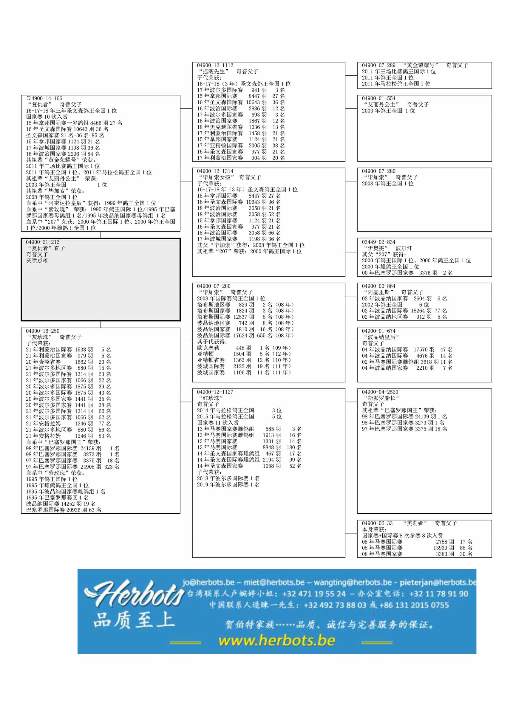 荣获: 2008年国际赛鸽王全国1位– 塔贝斯国际赛 12,537羽8名– 波品纳国家赛 1,810羽16名