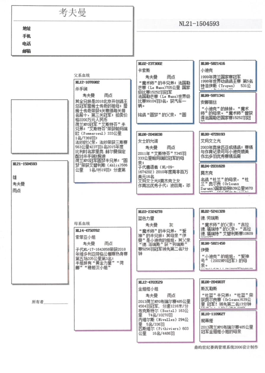 孙代代表及佳绩:“文多” (19年百万美元大奖赛决赛3名) – “阿玛诺” (罗礼斯国家赛4区 6,086羽1名) -“思凡” (森斯10-11区分速10,701羽1名)