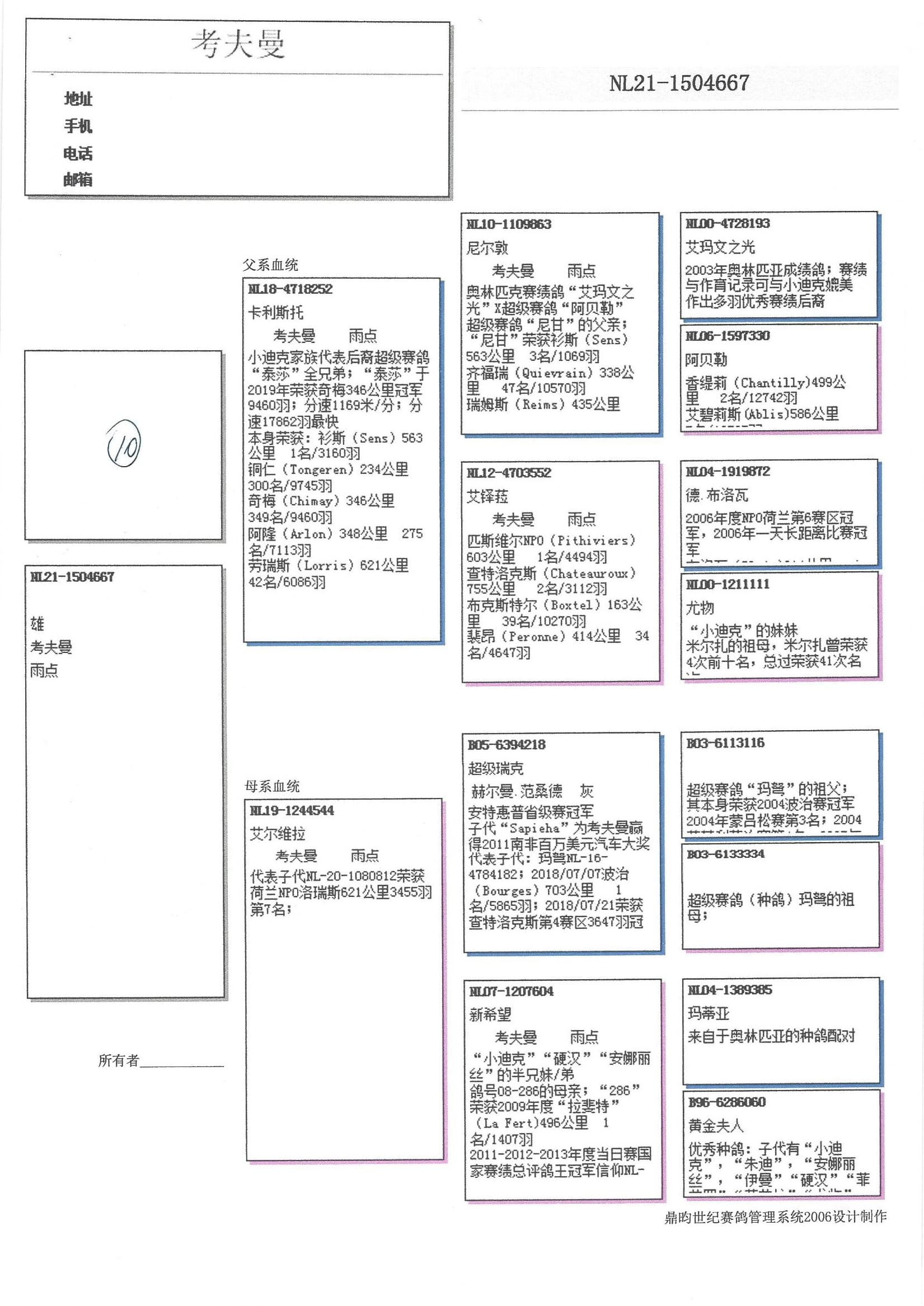 “玛弩”: NPO 查特鲁国家赛4区 3,647羽1名 - 分速19,192羽1名- NPO 波治国家赛4区 5,877羽1名 – 森斯 1,069羽1名