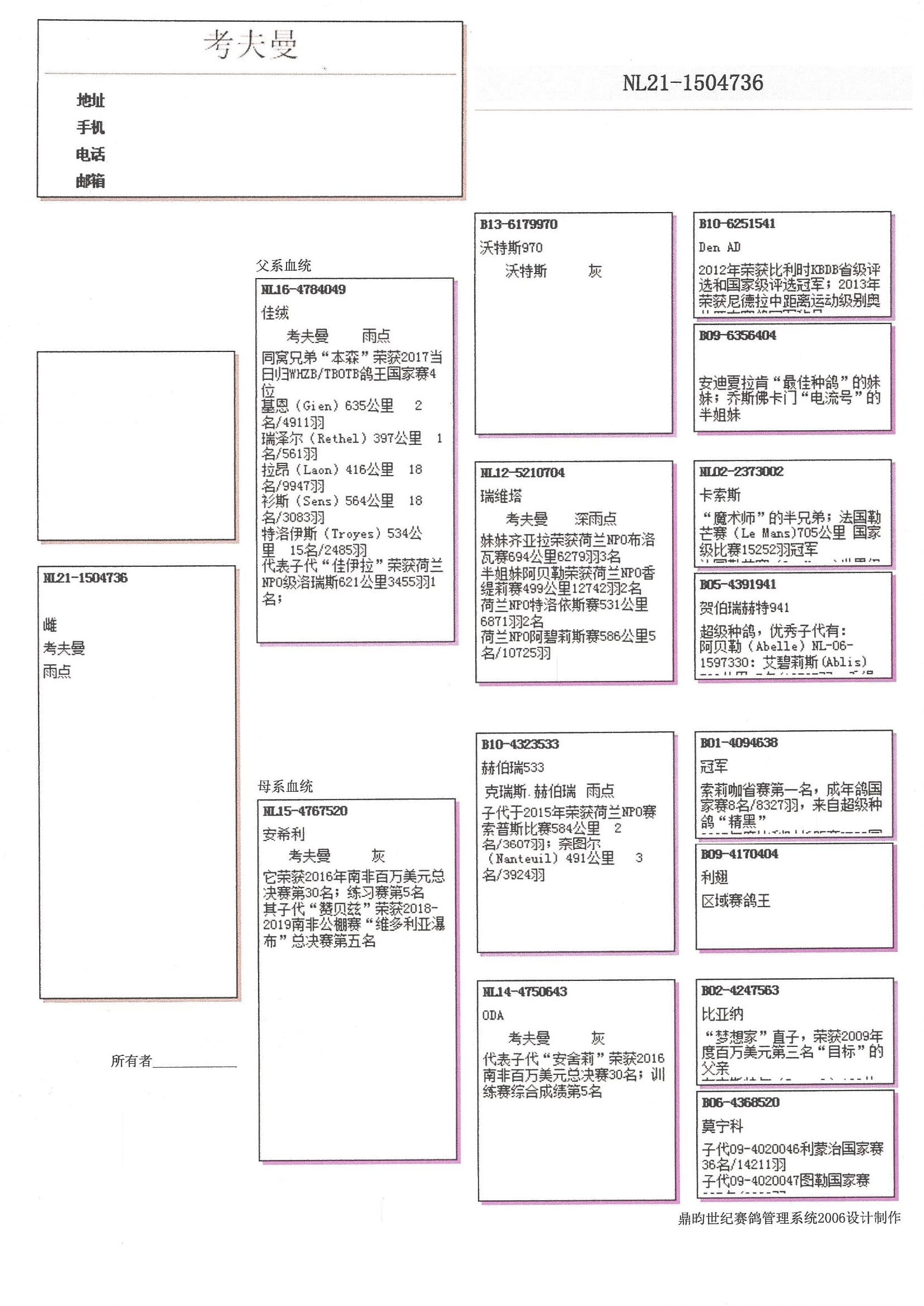 子代代表及佳绩:“泽莉娜” (NPO 罗礼斯 1,727羽11名