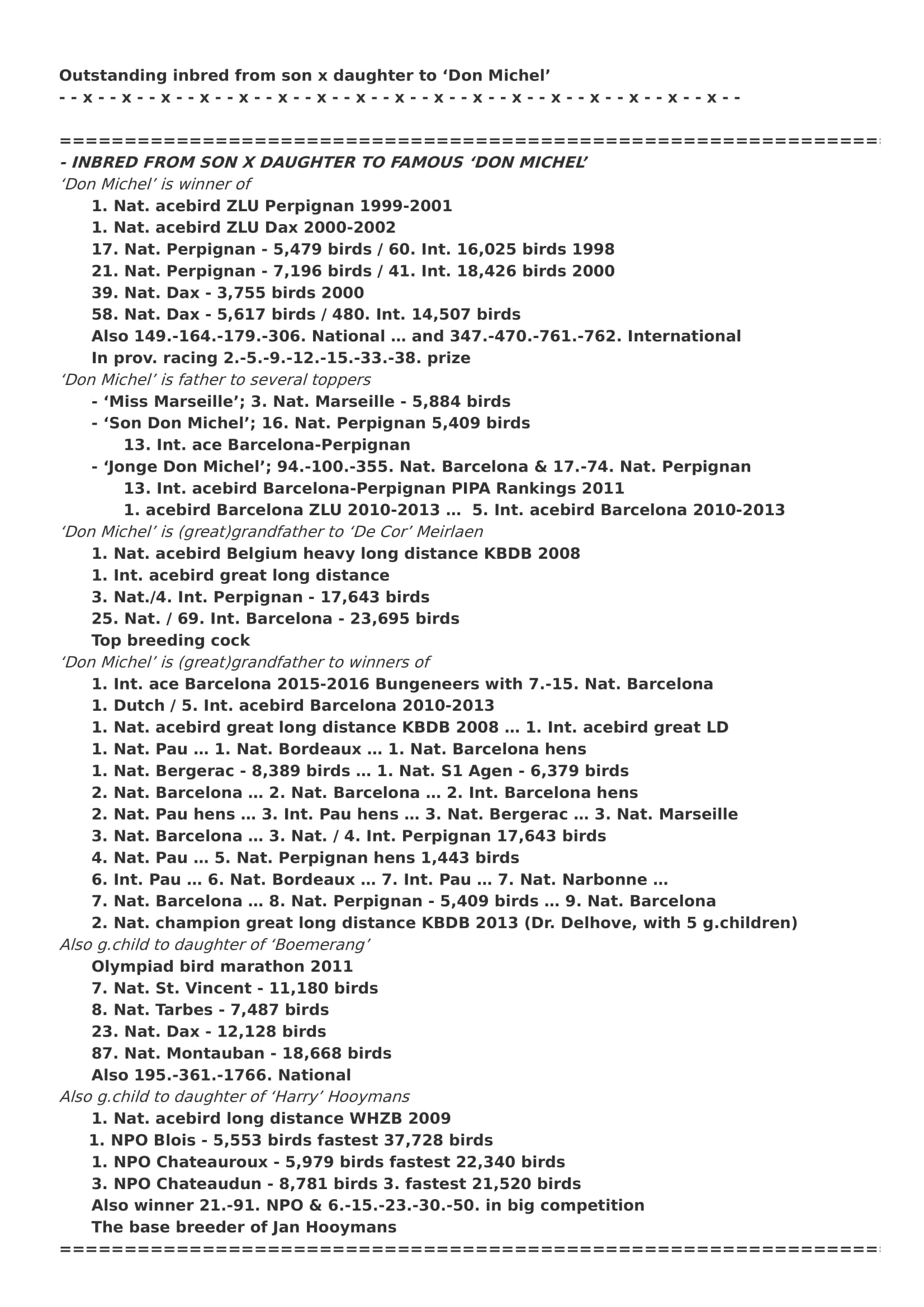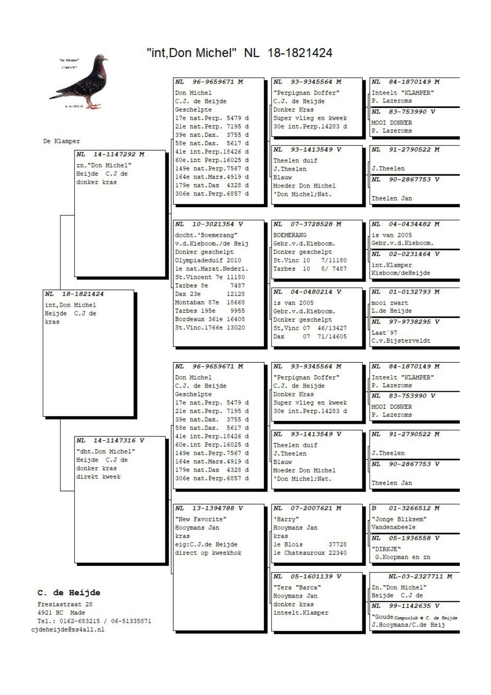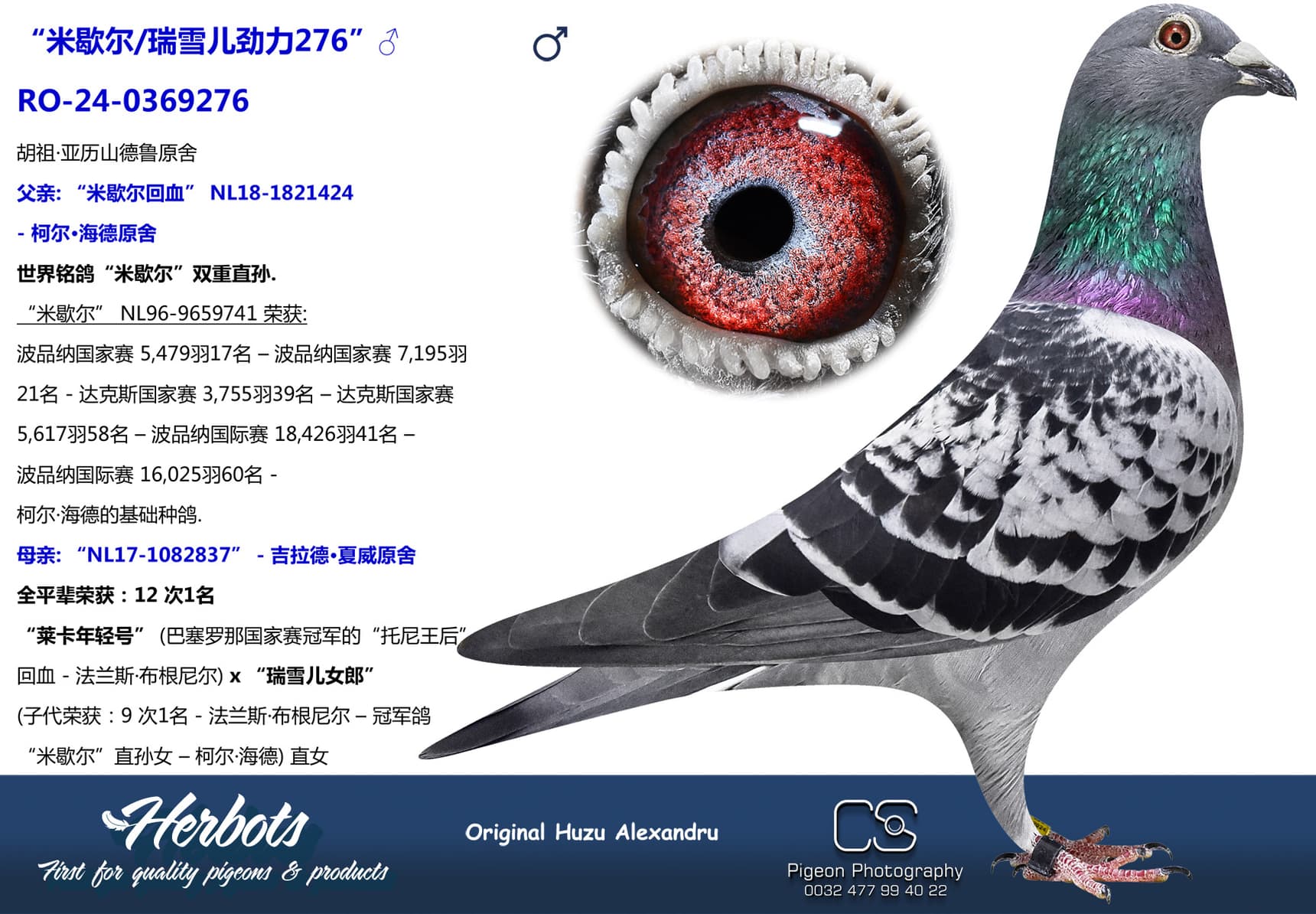 “莱卡年轻号” (巴塞罗那国家赛冠军的“托尼王后” 回血 - 法兰斯·布根尼尔) x “瑞雪儿女郎” (子代荣获:9 次1名 - 法兰斯·布根尼尔 – 冠军鸽 “米歇尔”直孙女 – 柯尔·海德) 直女
