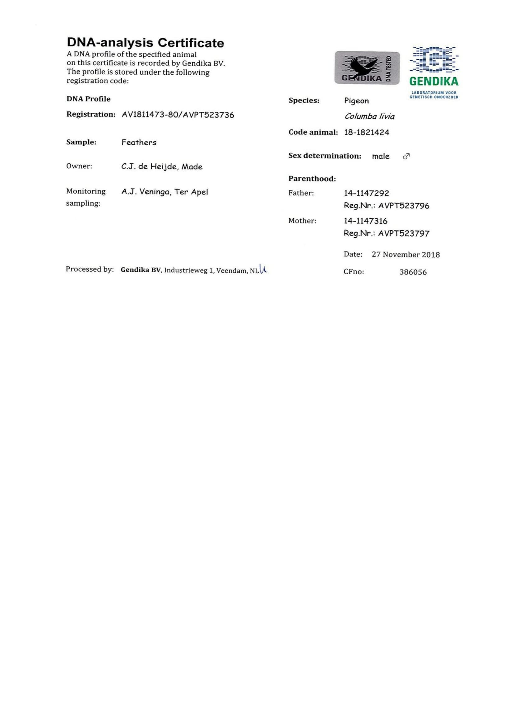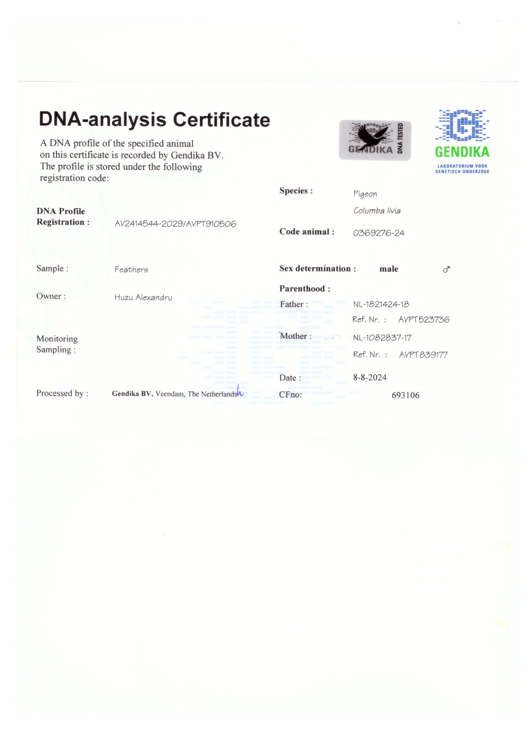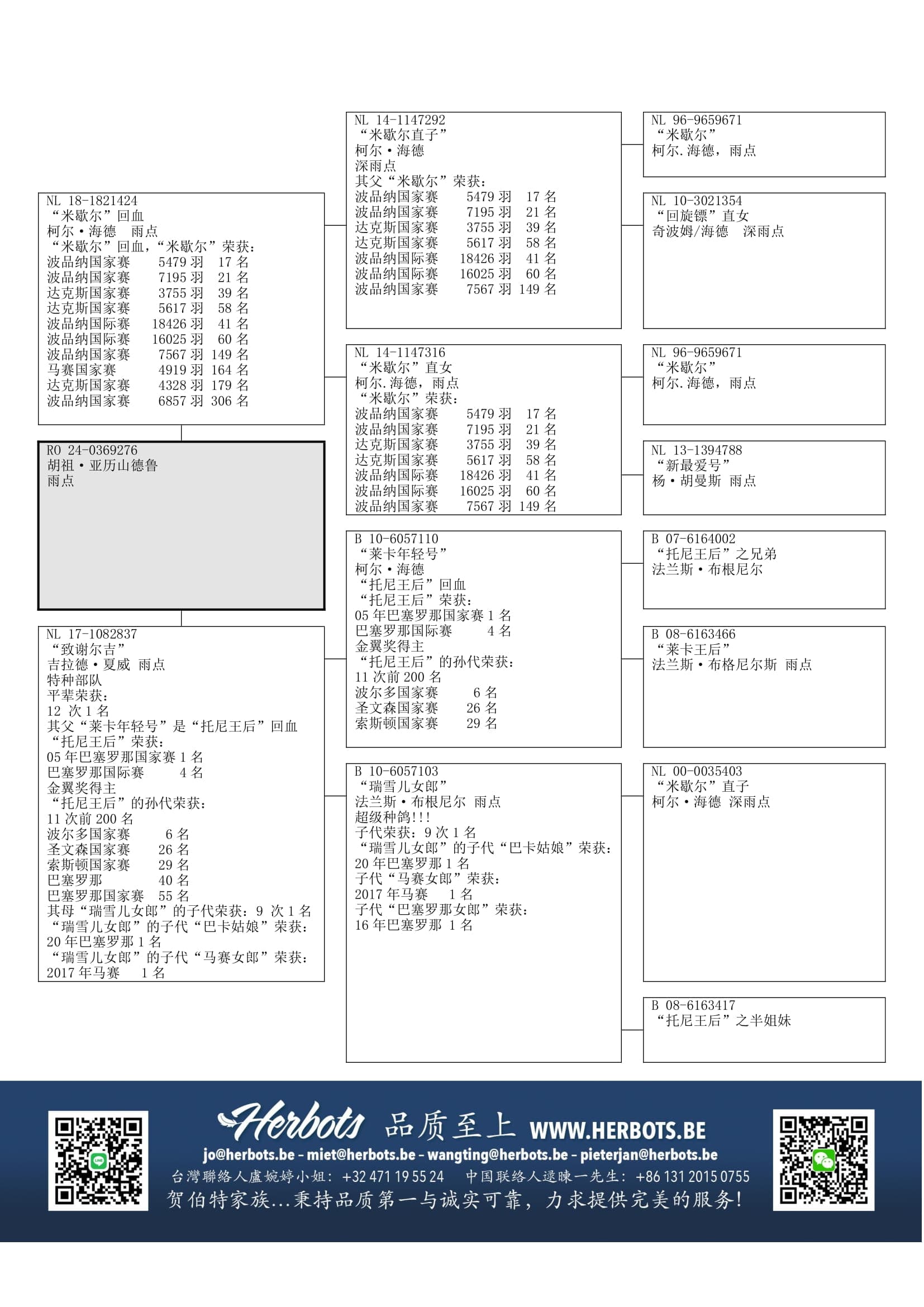 “莱卡年轻号” (巴塞罗那国家赛冠军的“托尼王后” 回血 - 法兰斯·布根尼尔) x “瑞雪儿女郎” (子代荣获:9 次1名 - 法兰斯·布根尼尔 – 冠军鸽 “米歇尔”直孙女 – 柯尔·海德) 直女