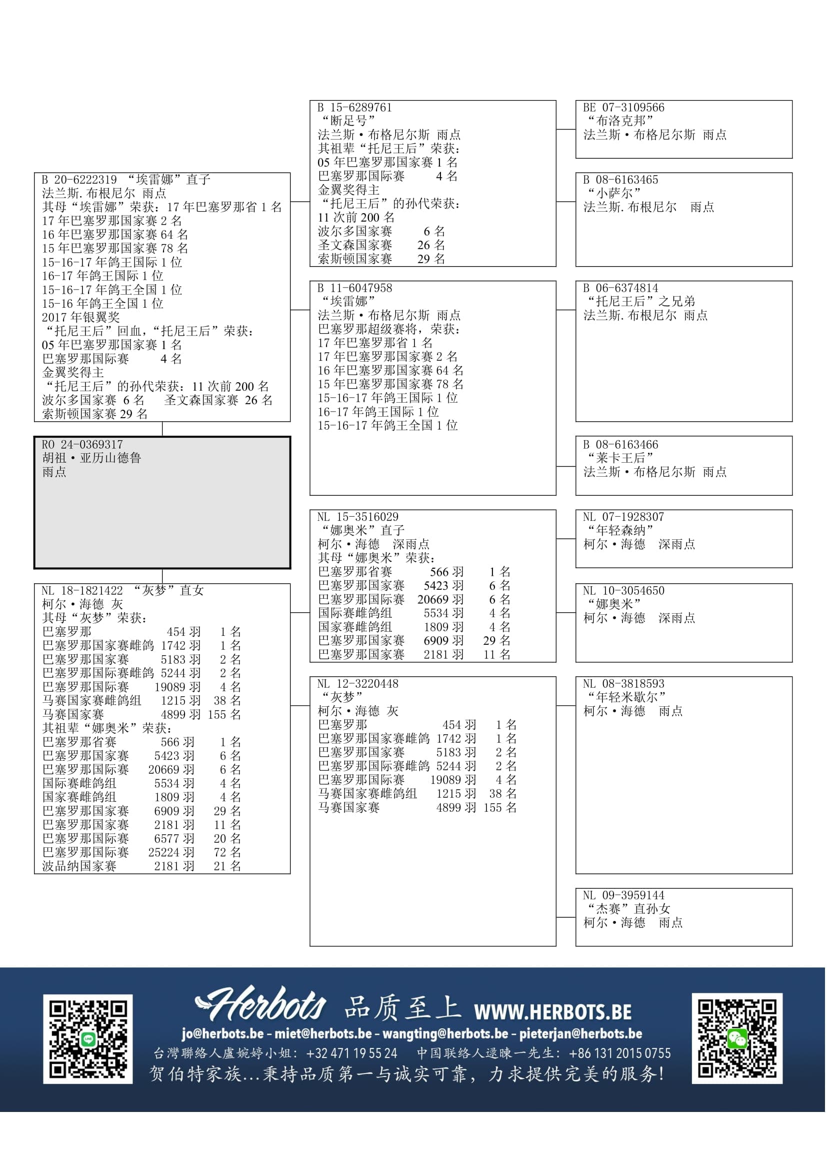 巴塞罗那国家赛雌鸽组 1,742羽1名 – 国家赛5,183羽2名 – 巴塞罗那国际赛雌鸽组 5,244羽2名 –国际赛19,089羽4名 – 马赛国家赛38名