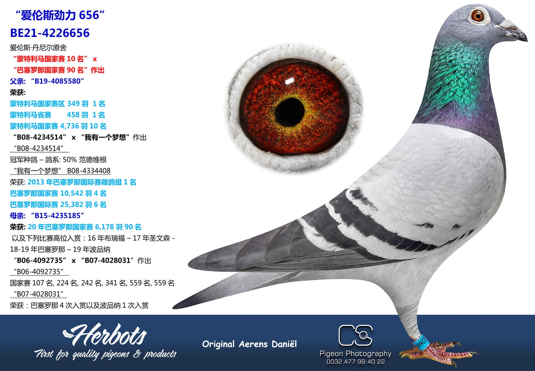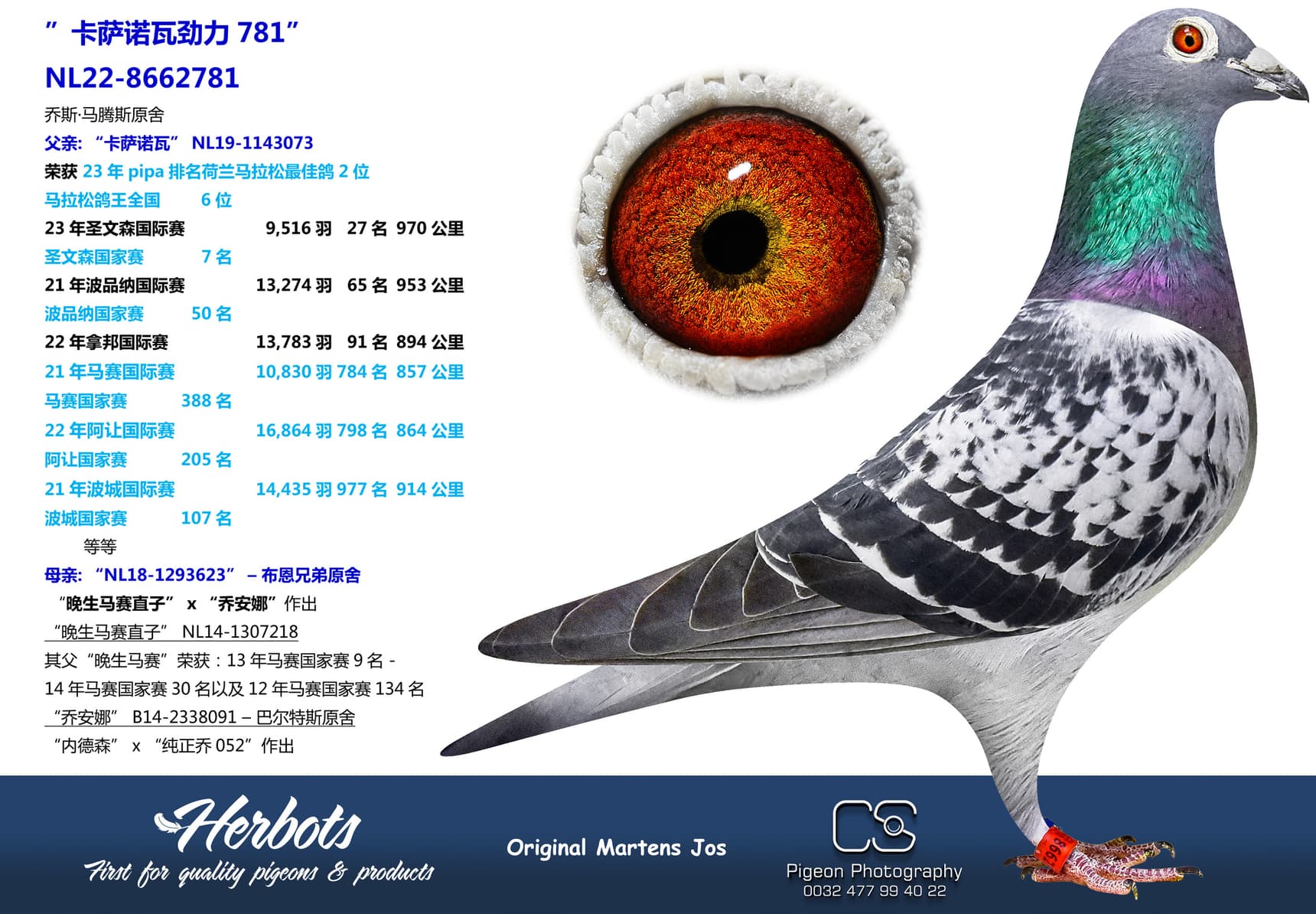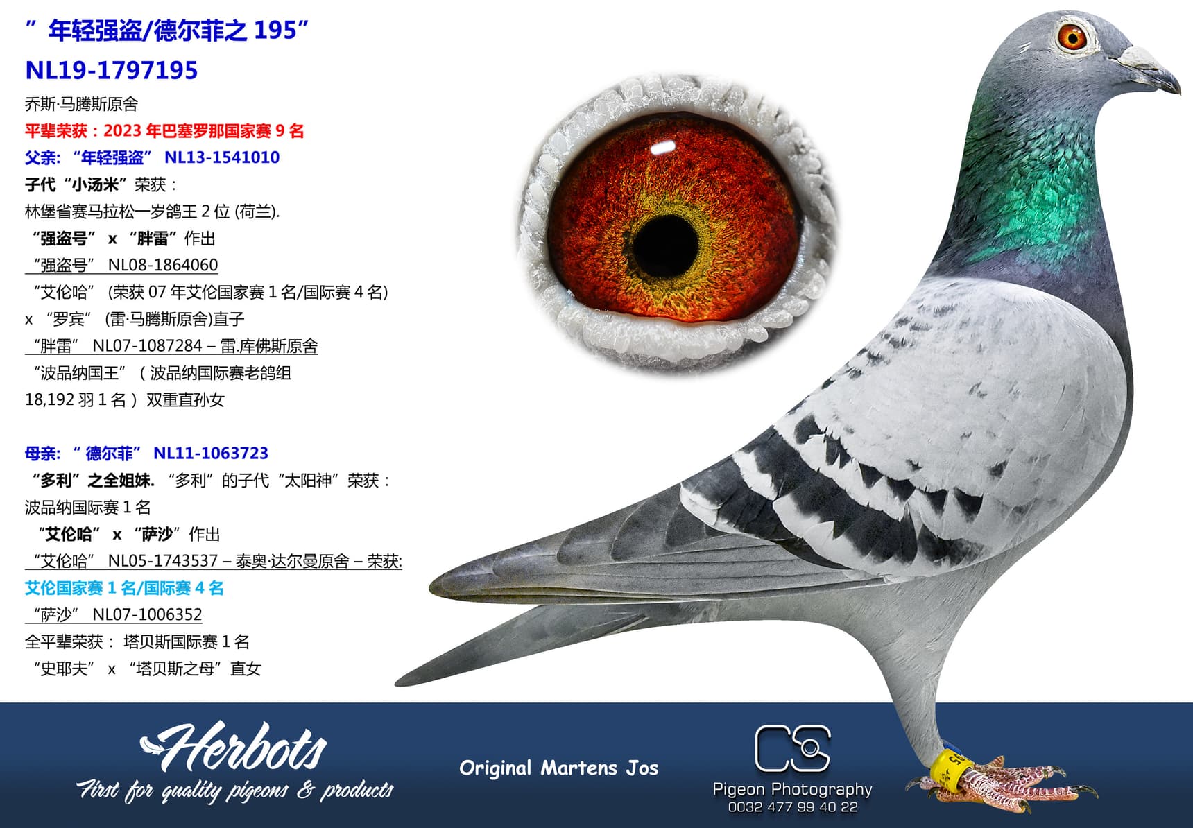 此期拍卖会,我们将提供 13 羽乔斯.马腾斯(Jos Martens, Stein) 原舍鸽和 2 羽丹尼尔.阿仁斯(Daniël Aerens, Drongen)原舍鸽。
