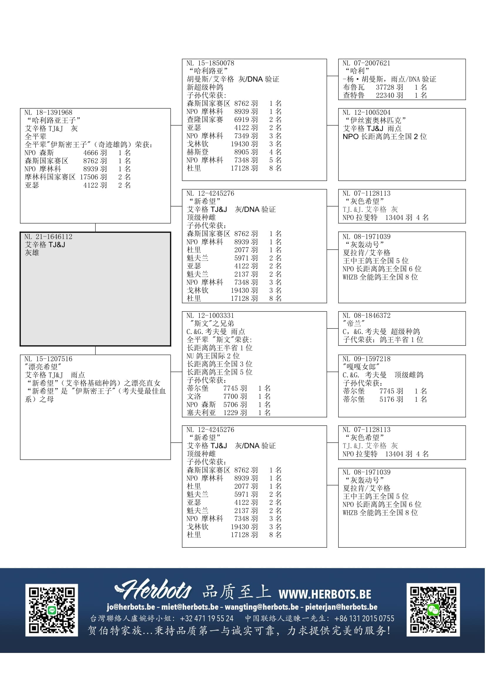 “灰色希望” (NPO 拉斐特4名;后代荣获12年和15年2次长距离鸽王国际1位) x “灰轰动号” (NPO 8名, 11名, 17名, 26名和33名 - WHZB鸽王全国4-8-10位) 直女