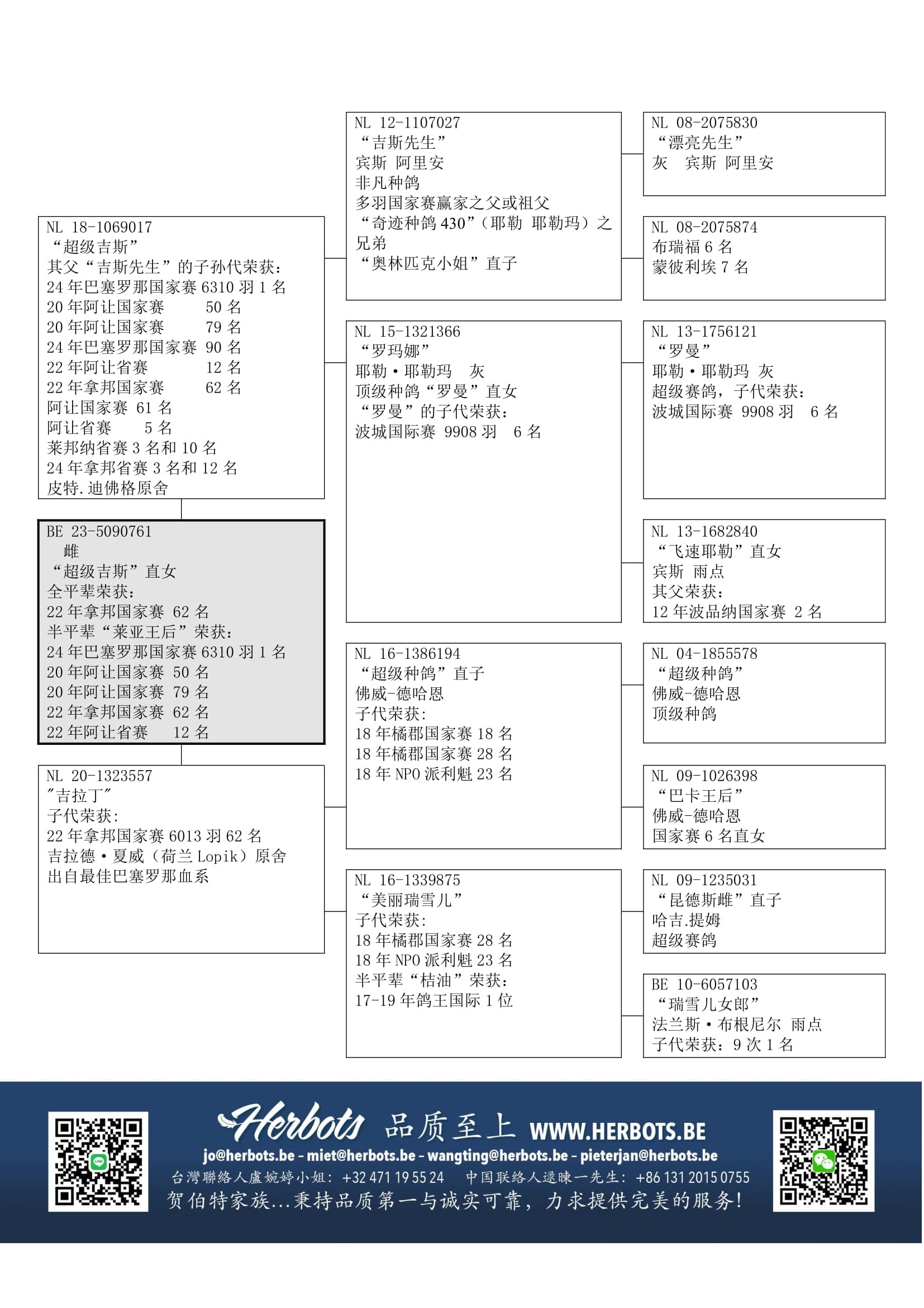 “吉斯先生” (耶勒 耶勒玛的著名种鸽“奇迹种鸽 430”之全兄弟) x “NL15-1321366 (耶勒 耶勒玛原舍;是12年波品纳国家赛2名直孙女;是波城国际赛6名之半姐妹)作出