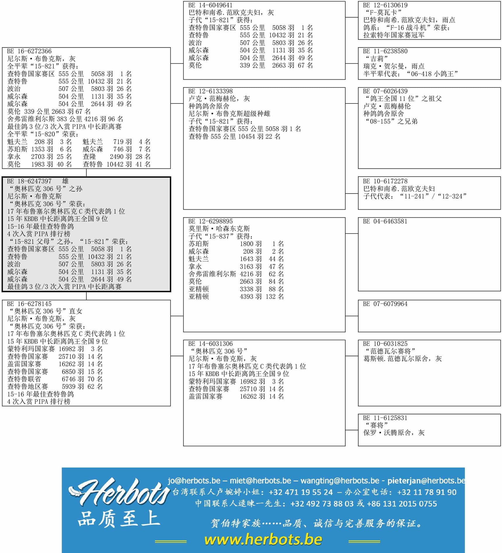 父亲:查特鲁国家赛区冠军之全兄弟”全平辈获得:查特鲁国家赛区 5058羽 1名查特鲁国家赛 10454羽 22名母亲:“奥林匹克306号直女”“奥林匹克306号”荣获:17年布达佩斯奥林匹克C类代表鸽1位