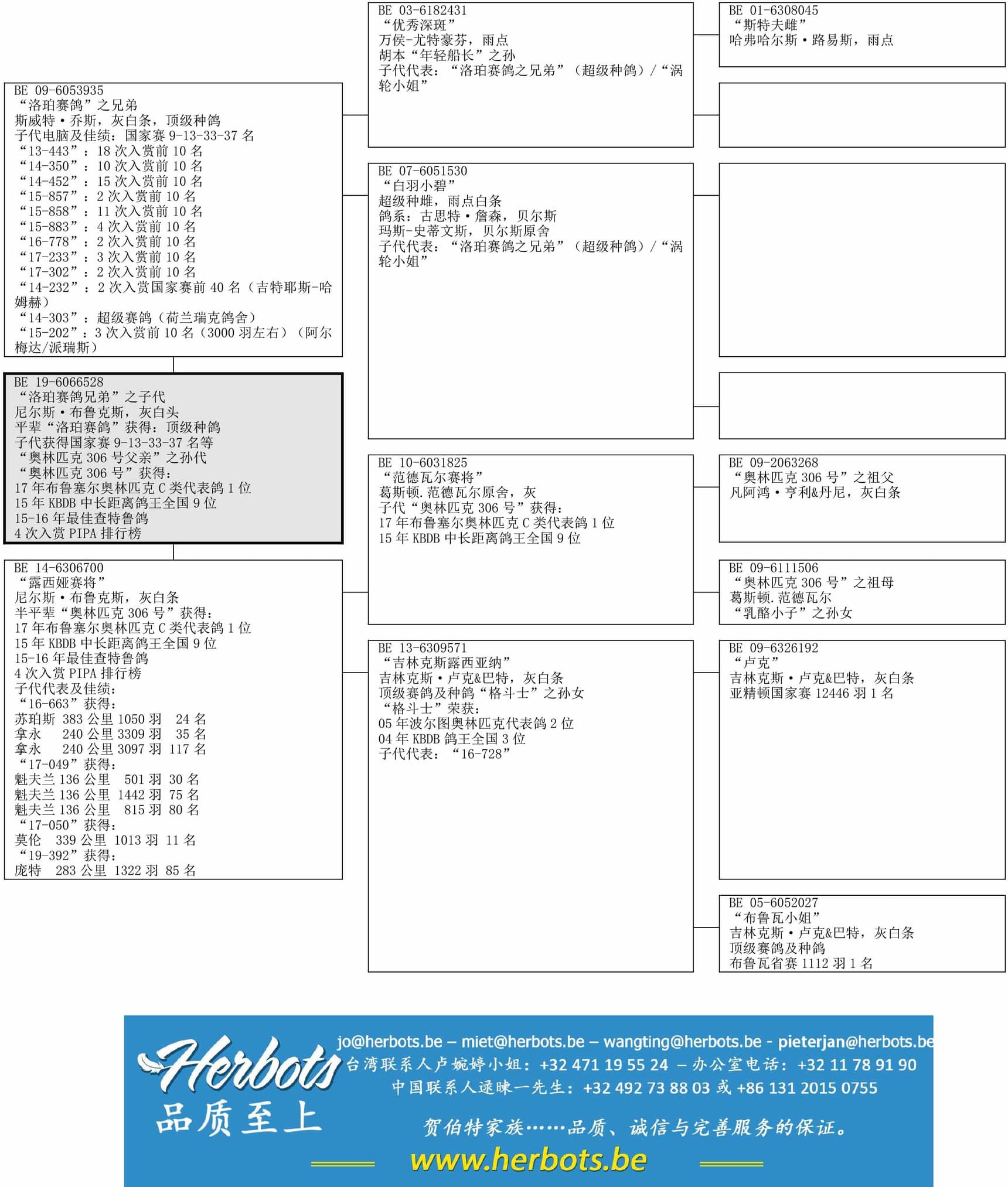 母亲:BE 14-6306700“露西娅赛将”历经考验的种雌,子代获得:1013羽11名  1050羽24名  501羽30名  3309羽35名 - 半平辈“奥林匹克306号”获得:17年布达佩斯奥林匹克C类代表鸽1位