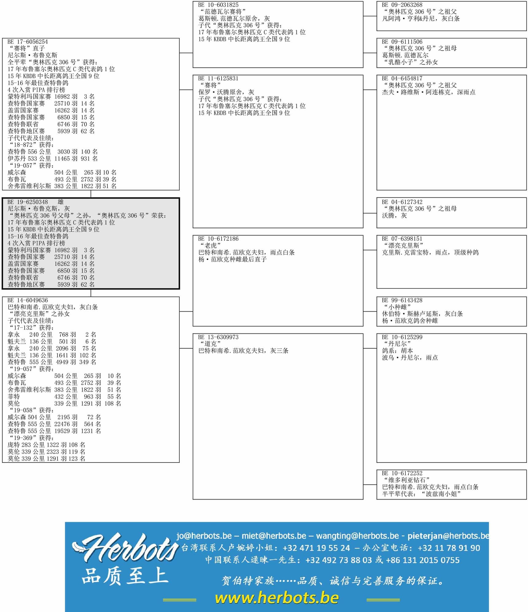 父亲:BE 17-6056254“赛将直子”历经考验的种鸽,全平辈“奥林匹克306号”获得:17年布达佩斯奥林匹克C类代表鸽1位母亲:BE 14-6049636“漂亮克里斯之孙女”历经考验的种雌,子代获得:拿永 768羽 2名 - 魁夫兰501羽 6名 - 威尔森265羽 10名 - 布鲁瓦2752羽 39名 - 舍弗雷维利尔斯 1822羽 51名