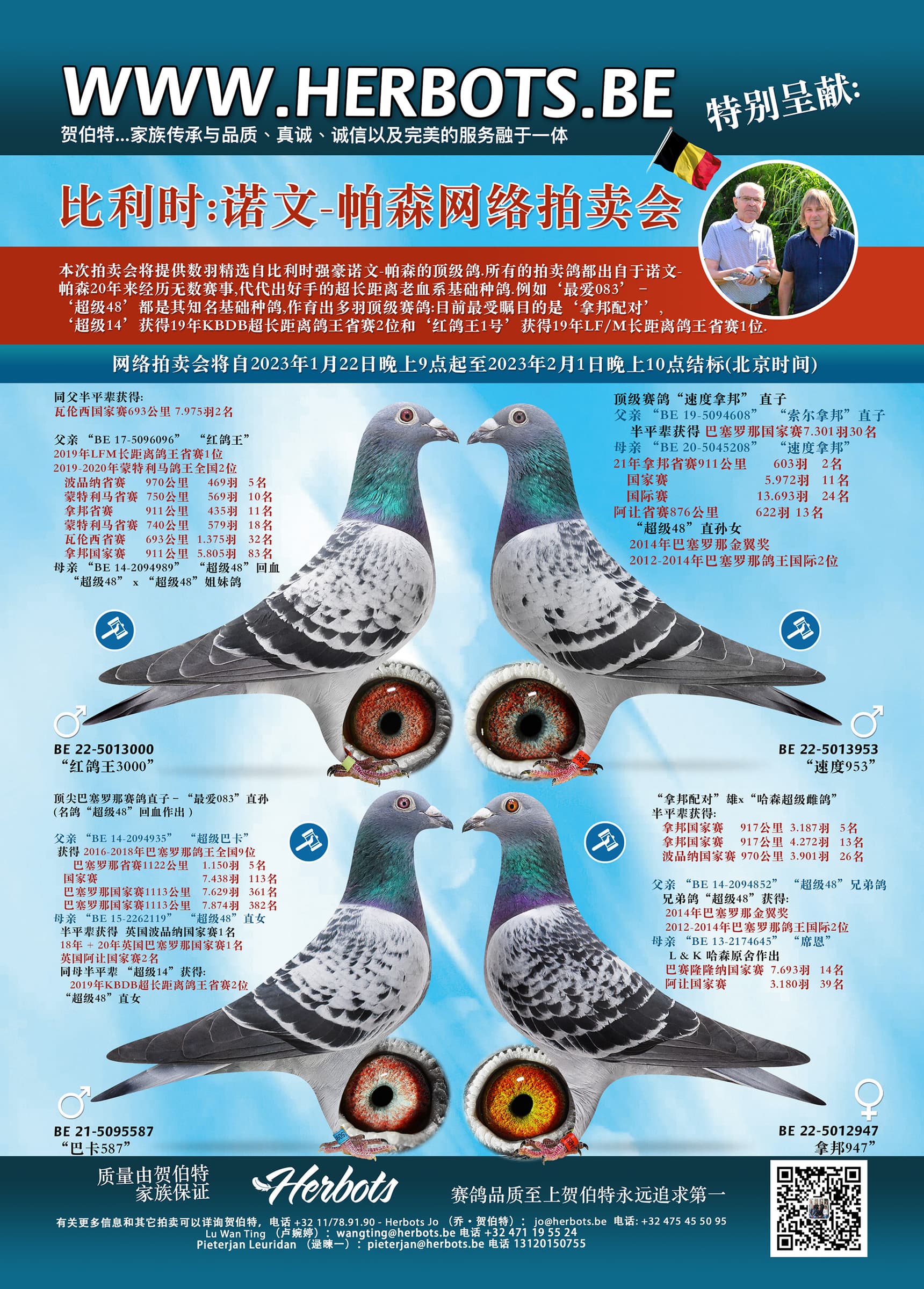 本次拍卖会将提供数羽精选自比利时强豪诺文-帕森的顶级鸽.所有的拍卖鸽都出自于诺文-帕森20年来经历无数赛事,代代出好手的超长距离老血系基础种鸽.例如‘最爱083’–‘超级48’都是其知名基础种鸽,作育出多羽顶级赛鸽:目前最受瞩目的是‘拿邦配对’,‘超级14’获得19年KBDB超长距离鸽王省赛2位和‘红鸽王1号’获得19年LF/M长距离鸽王省赛1位.