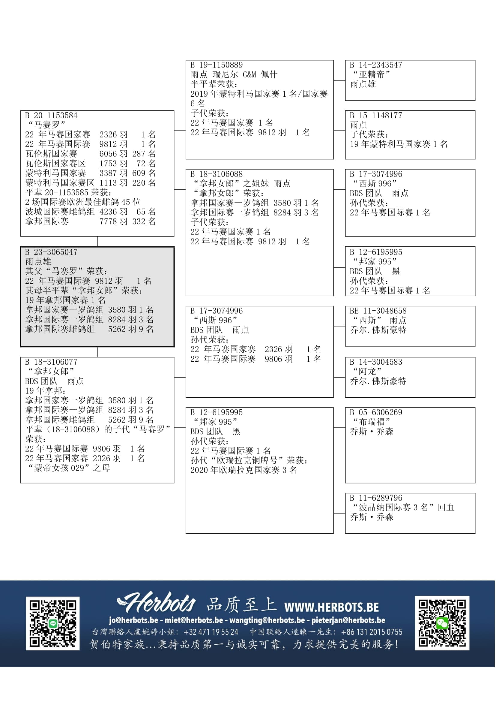 B19-1150889” (半平辈荣获:蒙特利马国家赛1名 - 瑞尼尔 G. & M.原舍 ) x “拿邦女郎之姐妹” (平辈荣获:拿邦国家赛1名/国际赛 8,284羽3名)作出