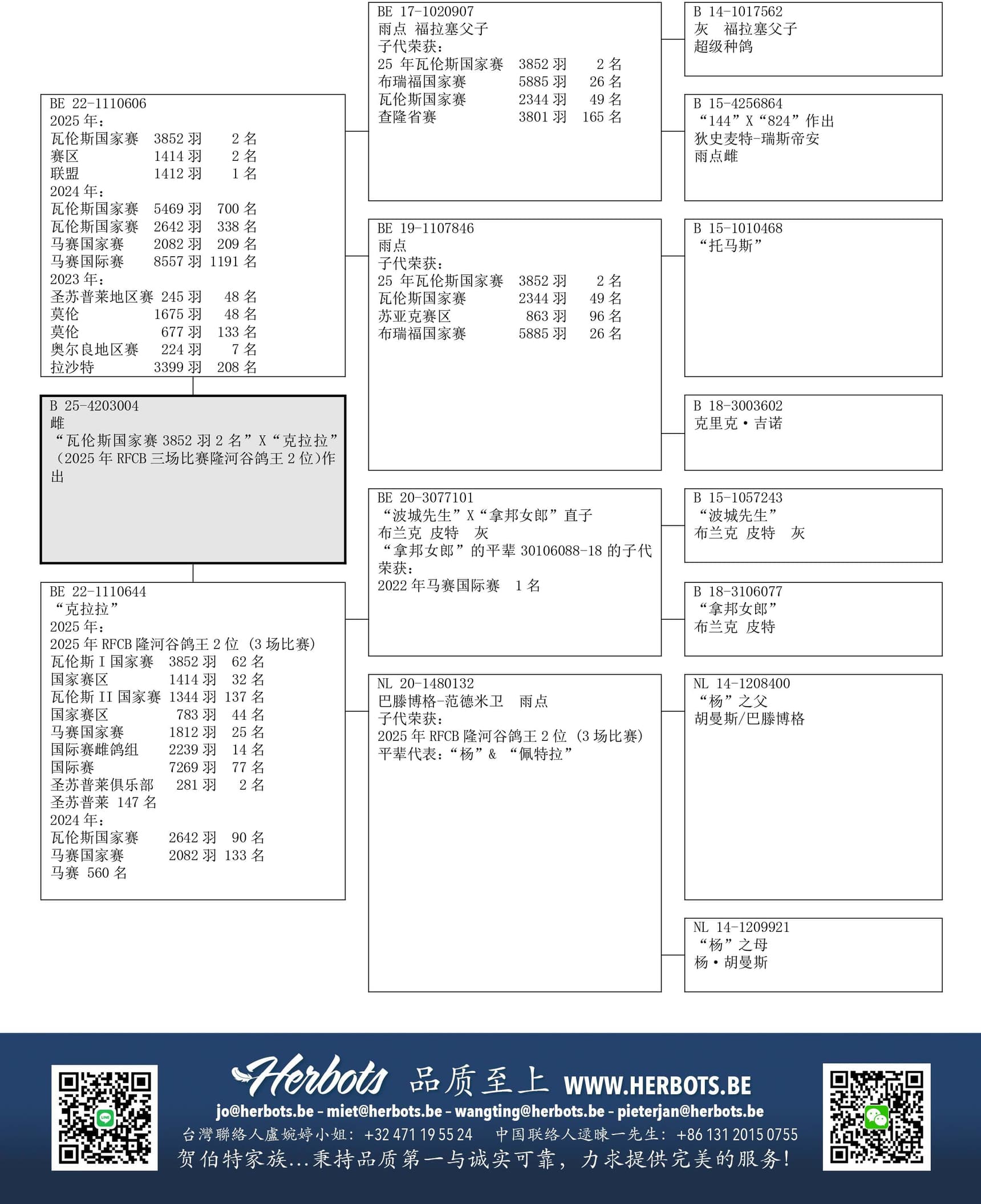 父亲: “瓦伦斯银牌” B22-1110606荣获: 2025年瓦伦斯国家赛3,852羽2名其祖辈“托马斯”荣获: