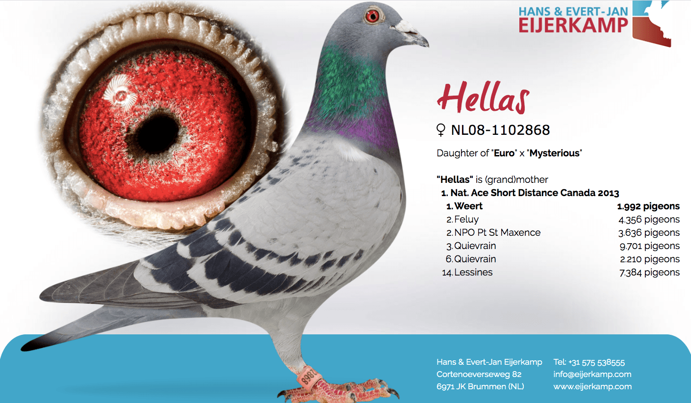由 “奥林匹克利奥”(详情见上文) x “希腊雌” (“欧元号”直孙女– 作出孙代荣获:加拿大国家赛短距离鸽王冠军– 塔拉莫尔20315羽冠军 – 尼尔尼斯5573羽冠军. –韦尔特1992羽冠军,等等优异赛绩)作出的直女