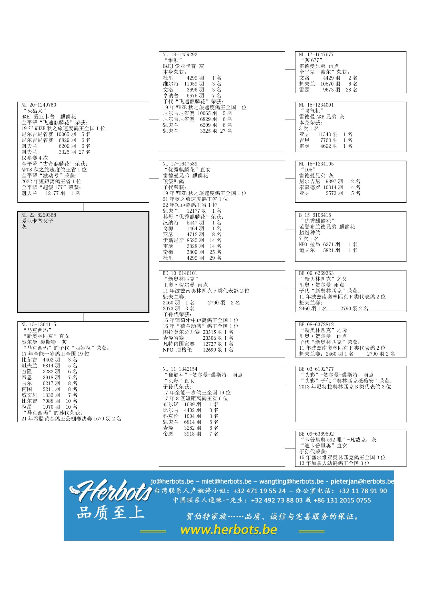 2021年秋之旅短距离鸽王省1位 – 2019年WHZB 秋之旅短距离鸽王全国1位 – 2022年短距离鸽王省1位 – 魁夫兰 12,177羽1名 – 赫斯登7,293羽1名