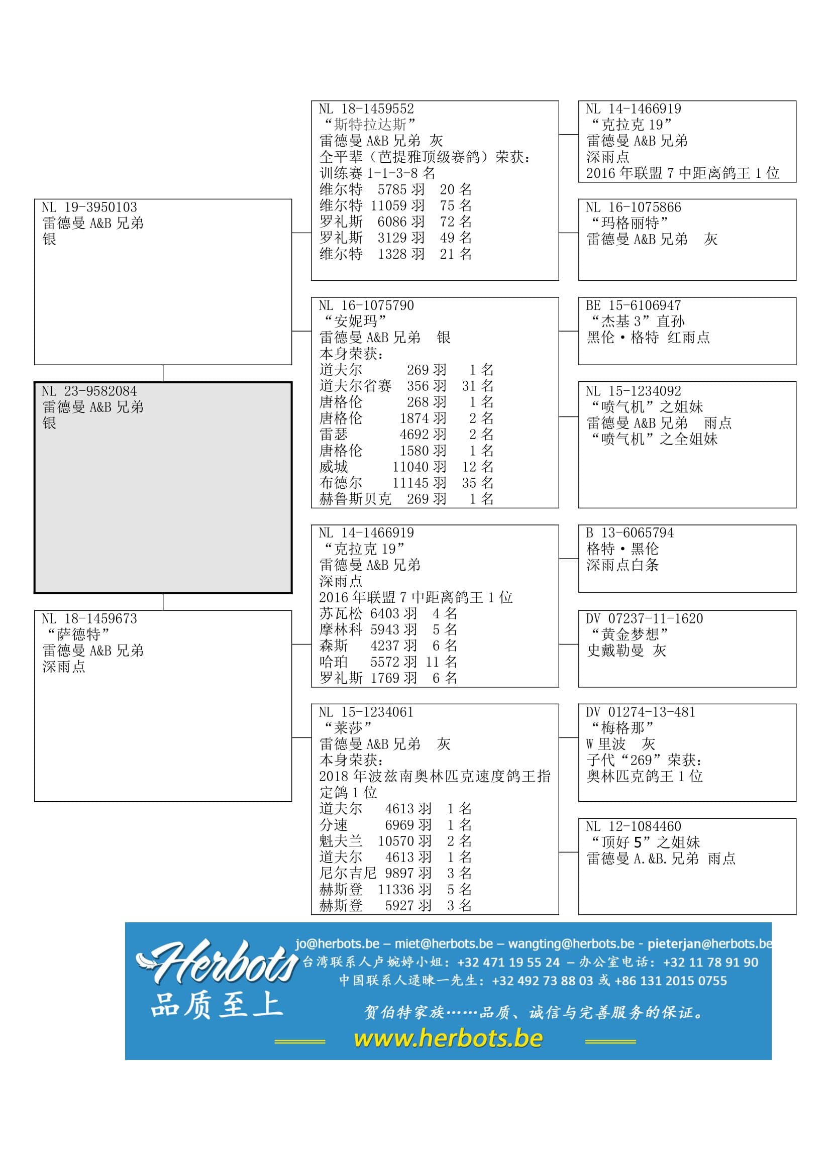 18年波兹南奥林匹克指定鸽1位 – 道夫尔分速 6,969羽1名 - 10,570羽2名 – 9,897羽3名 – 11,336羽5名 – 5,927羽3名