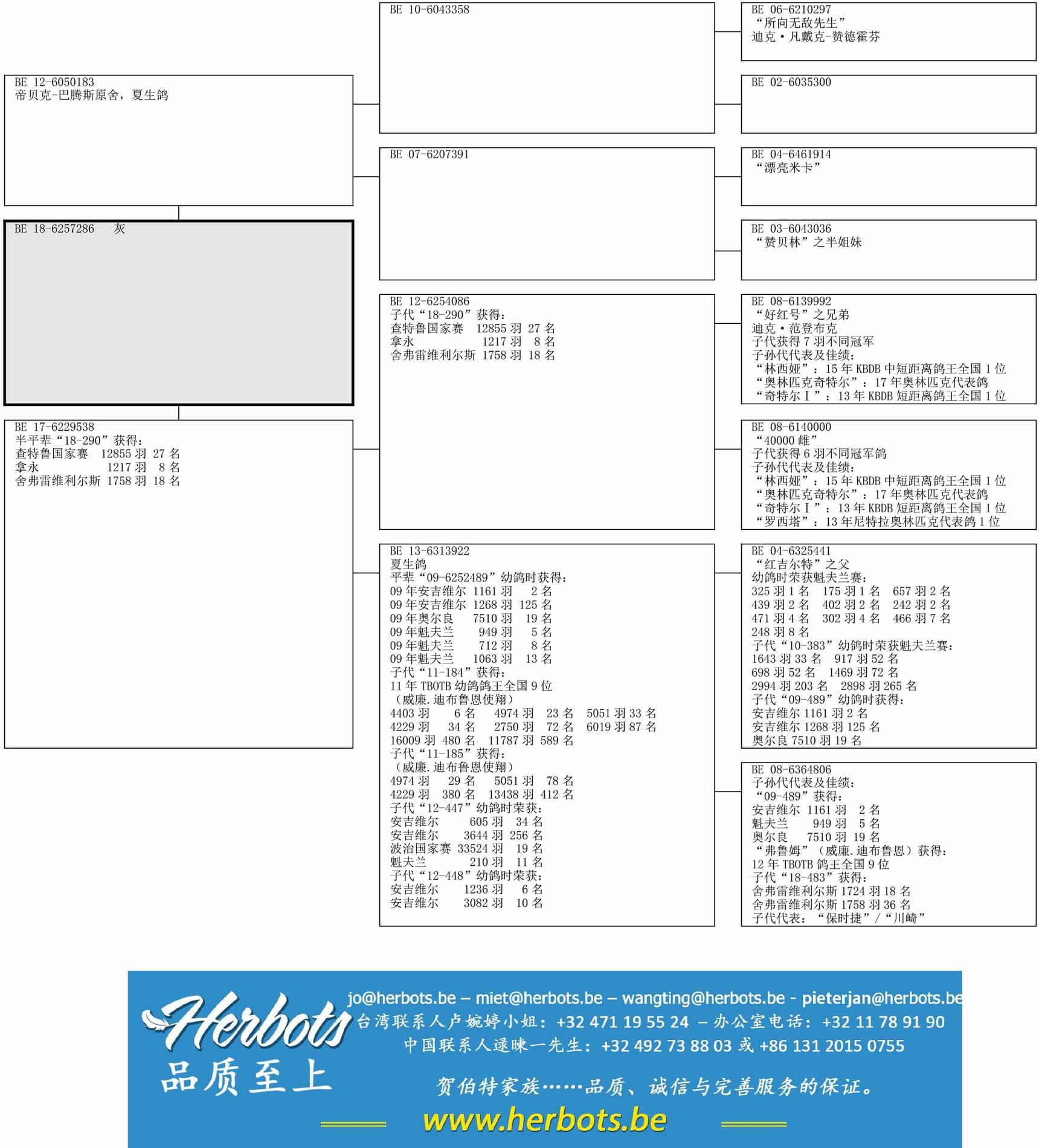 母亲: “B17-6229538”半平辈 “18-290”获得:拿永 1217羽 8名舍弗雷维利尔斯 1758羽 18名查特鲁国家赛 12855羽 27名迪克·范登布克基础配对 “好红号之兄弟” x “40000雌”之孙女
