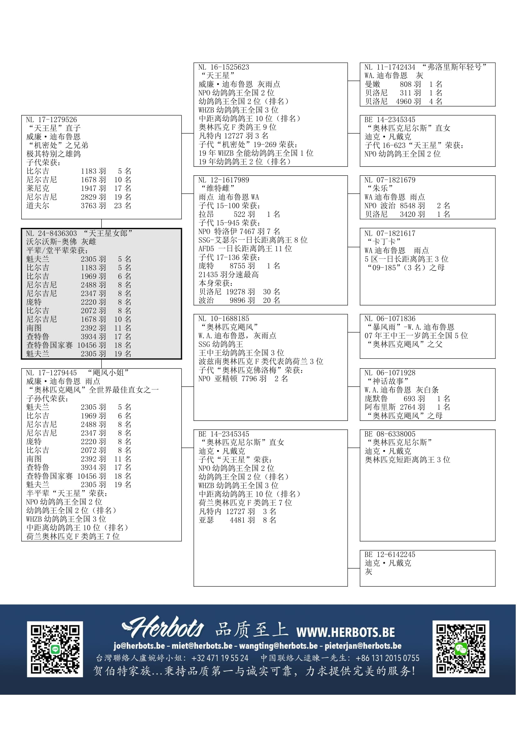 作出多代顶级赢家,如奥林匹克代表鸽“奥林匹克佛洛梅”