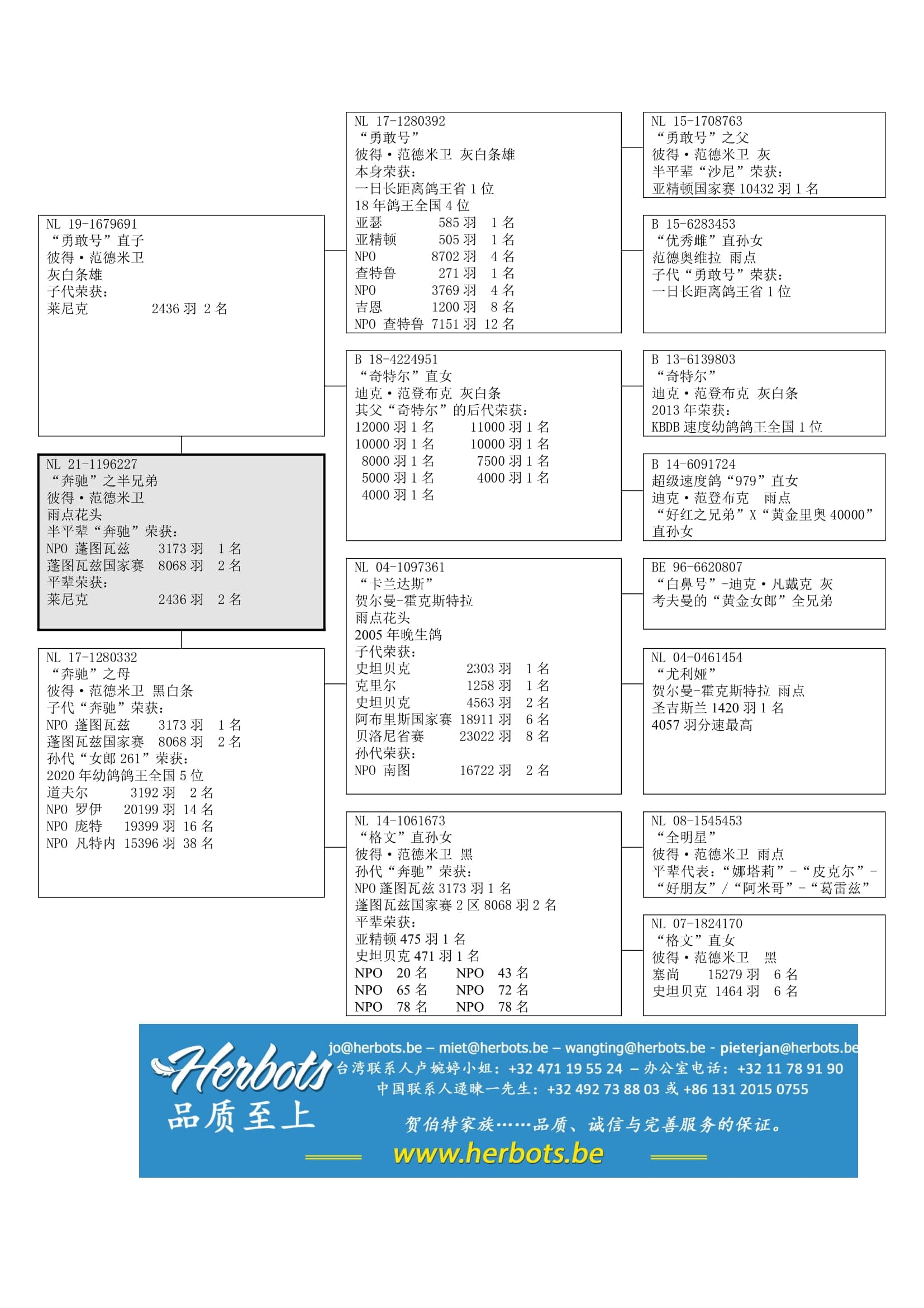 “勇敢号” (“勇敢号” 荣获14 次入赏 – 10次前1/10 - 6次前1/100 – 一日长距离鸽王省1位/全国4位 – 亚精顿国家赛 8,702羽4名 – 查特鲁国家赛 7,151羽12名) x “奇特尔直女” (其父“奇特尔”荣获:KBDB鸽王全国1位 – 范登布克) 作出