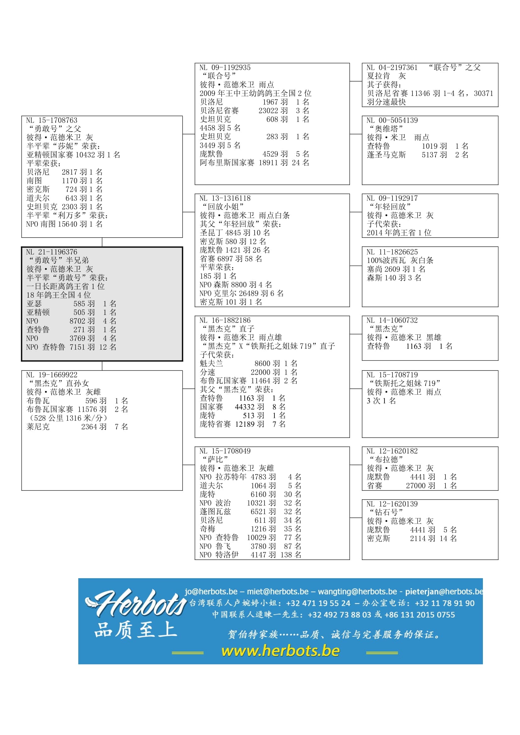 14 次入赏 – 10 次前1/10 - 6 次前1/100 - 18年一日长距离鸽王省1位/全国4位 - 亚瑟 585羽1名 – 亚精顿国家赛 8,702羽4名 – NPO查特鲁 3,769羽4名 – 查特鲁国家赛 7,151羽12名
