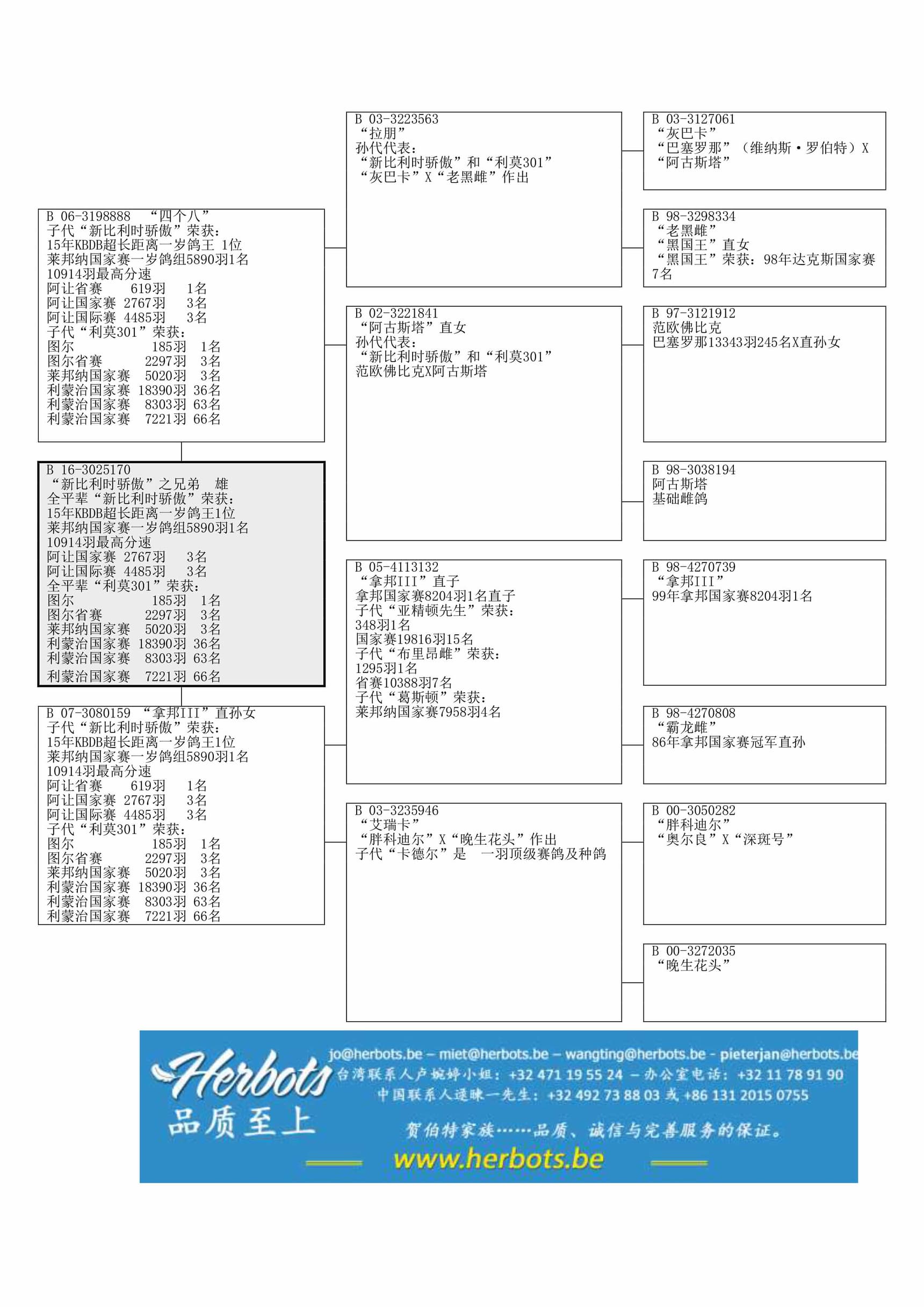全平辈“利莫 301”荣获:图尔省赛 2,297羽3名 - 莱邦纳国家赛 5,024羽3名 - 14年利蒙治国家赛18,390羽36名 - 15年利蒙治国家赛 8,303羽63名 - 14年利蒙治II国家赛 7,221羽66名