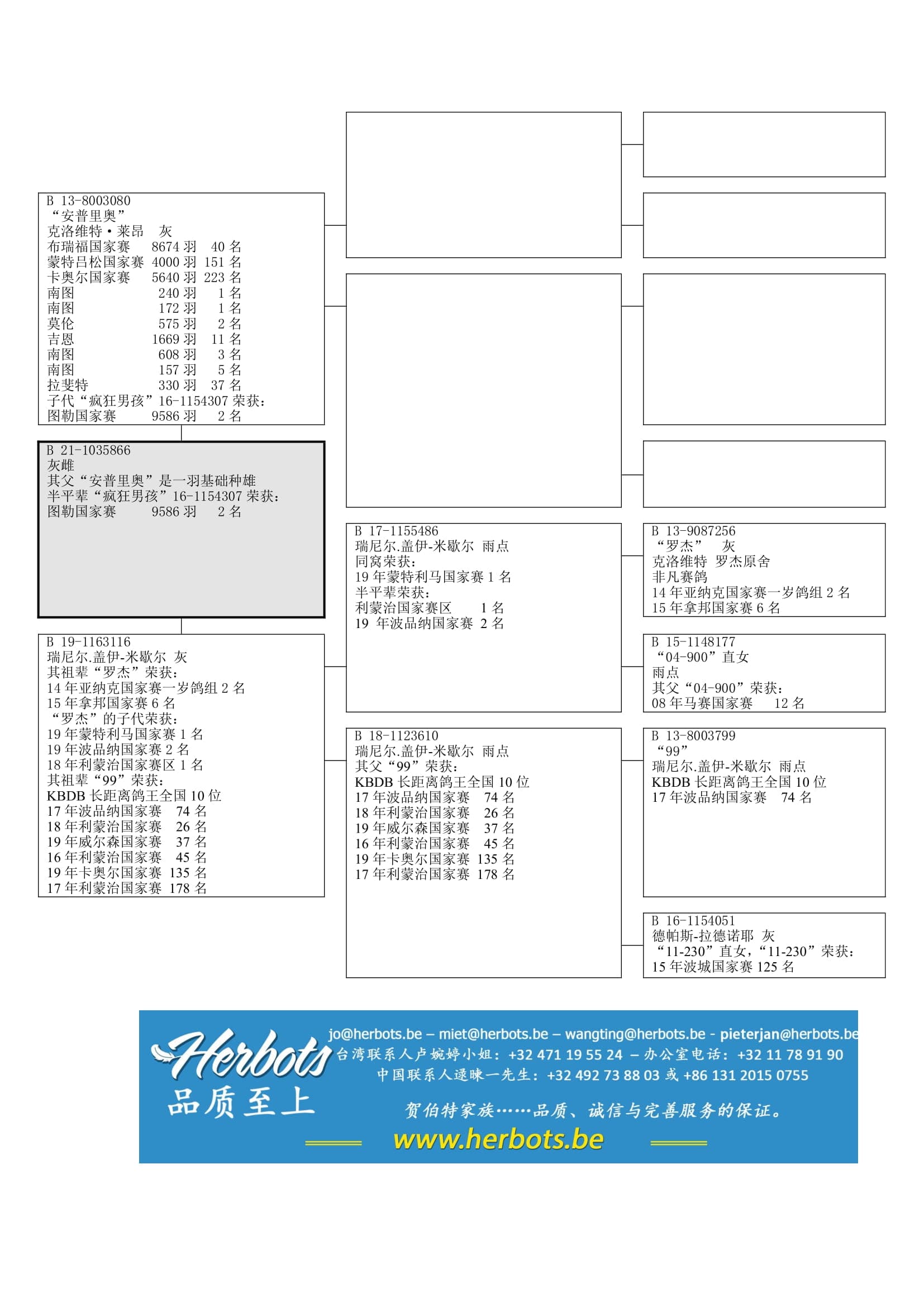 KBDB 长距离鸽王全国10位 – 利蒙治国家赛26名 - 19年威尔森国家赛37名 – 16年利蒙治国家赛45名 - 17年波品纳国家赛74名