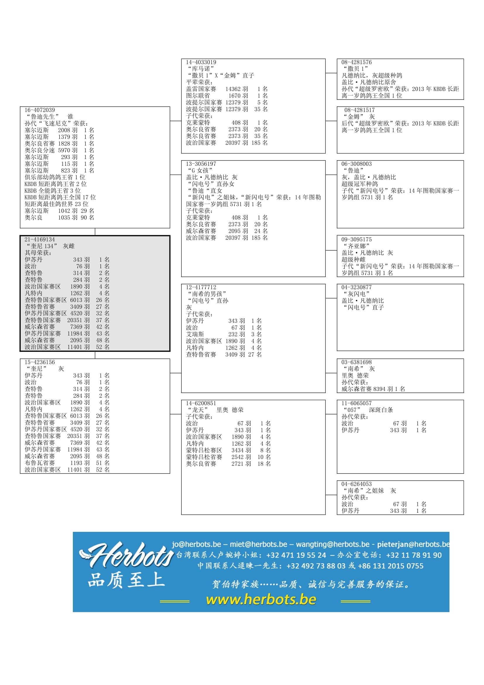 KBDB短距离鸽王省2位 – KBDB全能鸽王省3位 – KBDB短距离鸽王全国17位 – 塞尔迈斯 2,008羽1名 – 塞尔迈斯 1,379羽1名– 奥尔良省赛 5,970羽分速最高
