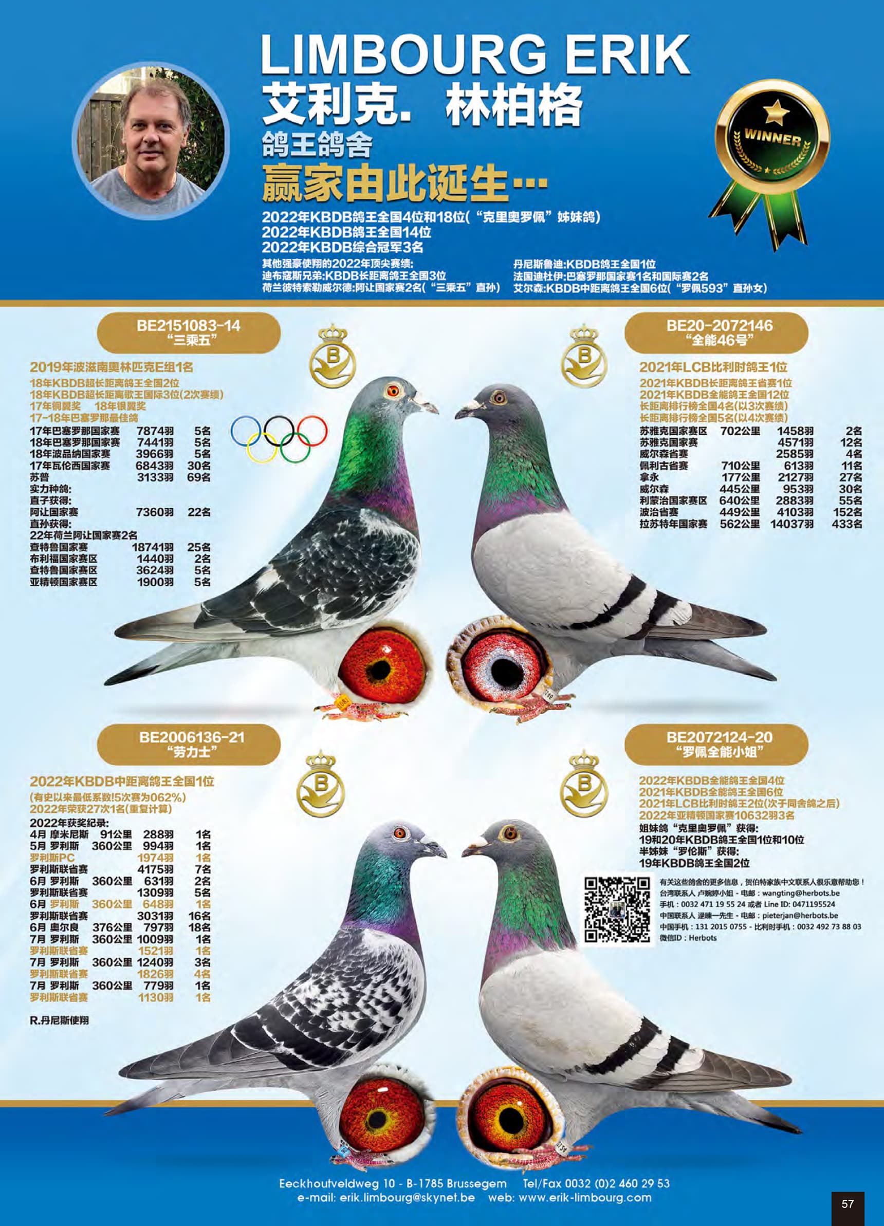 全平辈邦德及佳绩:“花花公子吉尔伯特” (KBDB中距离鸽王全国2位) 和“劲力003” (15年长距离一岁鸽王排名全国1位)