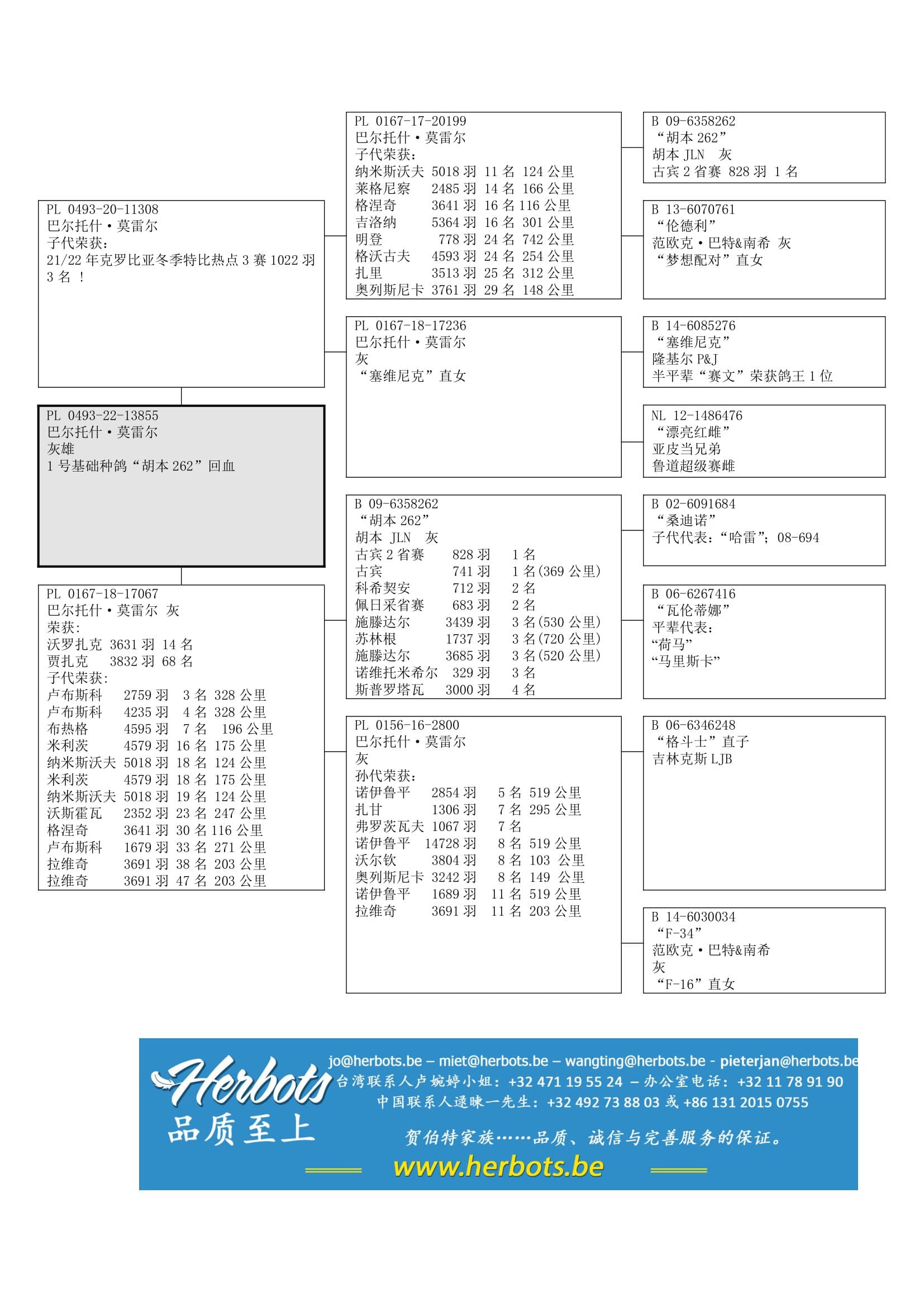 实力非凡种鸽 “PL0167-17-20199” x “PL016-18-17236” (鸽系: 隆基尔·锡安 x 克拉森 L.)作出