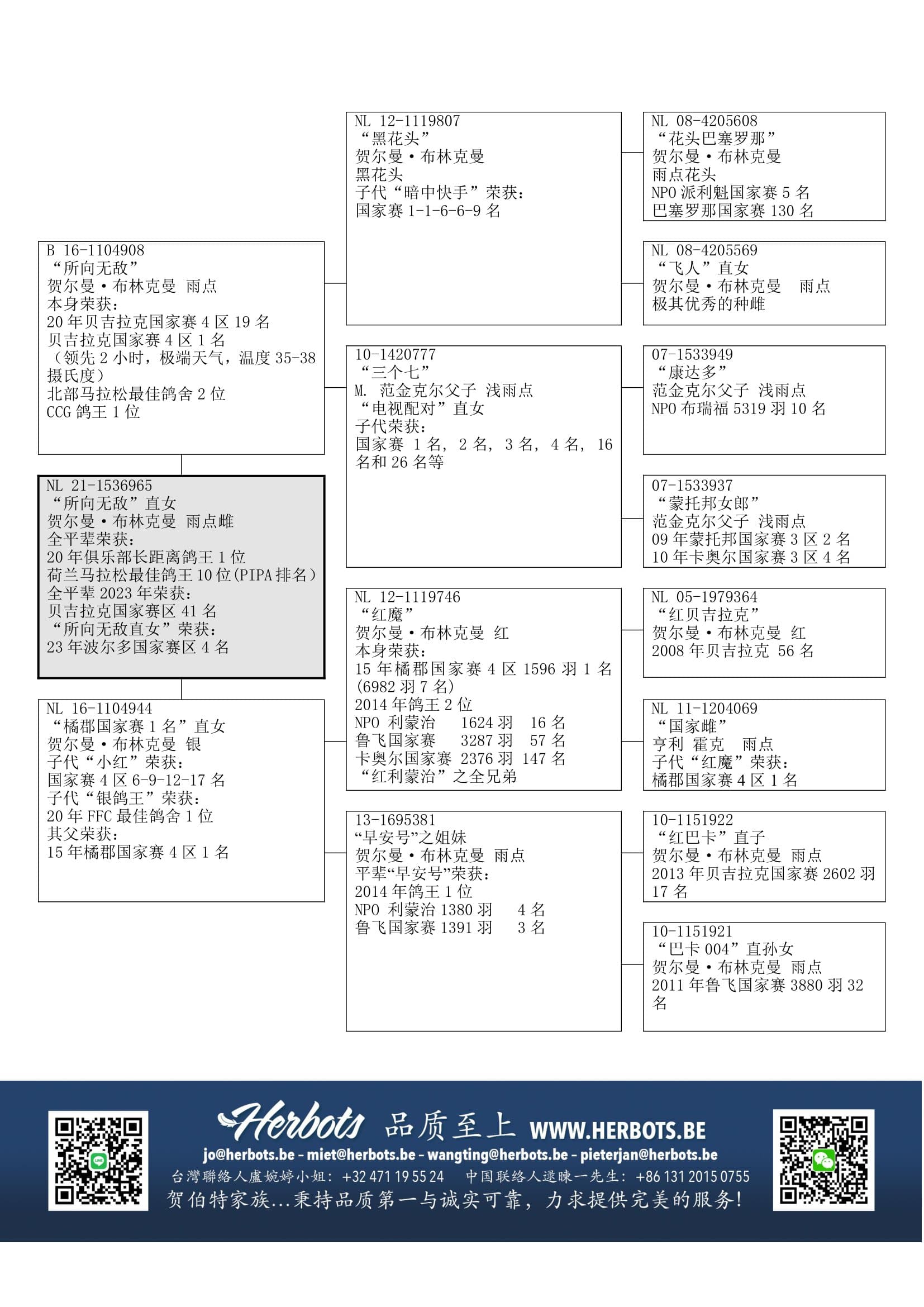 “黑花头” (子代荣获:国家赛4区 1名, 1名,6名, 6名和9名) x “三个七” (M.范金克尔原舍– 子代荣获:国家赛4区1名, 2名, 3名, 4名, 16名和26名)作出