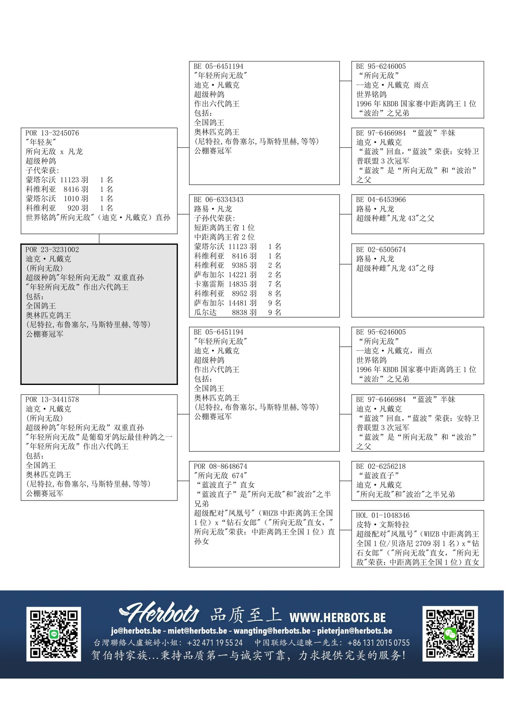作出六代各类比赛获奖鸽,如全国鸽王,奥林匹克代表鸽 (尼特拉, 布鲁塞尔, 马斯特里赫) 以及公棚赛获胜鸽 世界铭鸽“所向无敌” x “蓝波之姐妹”直子