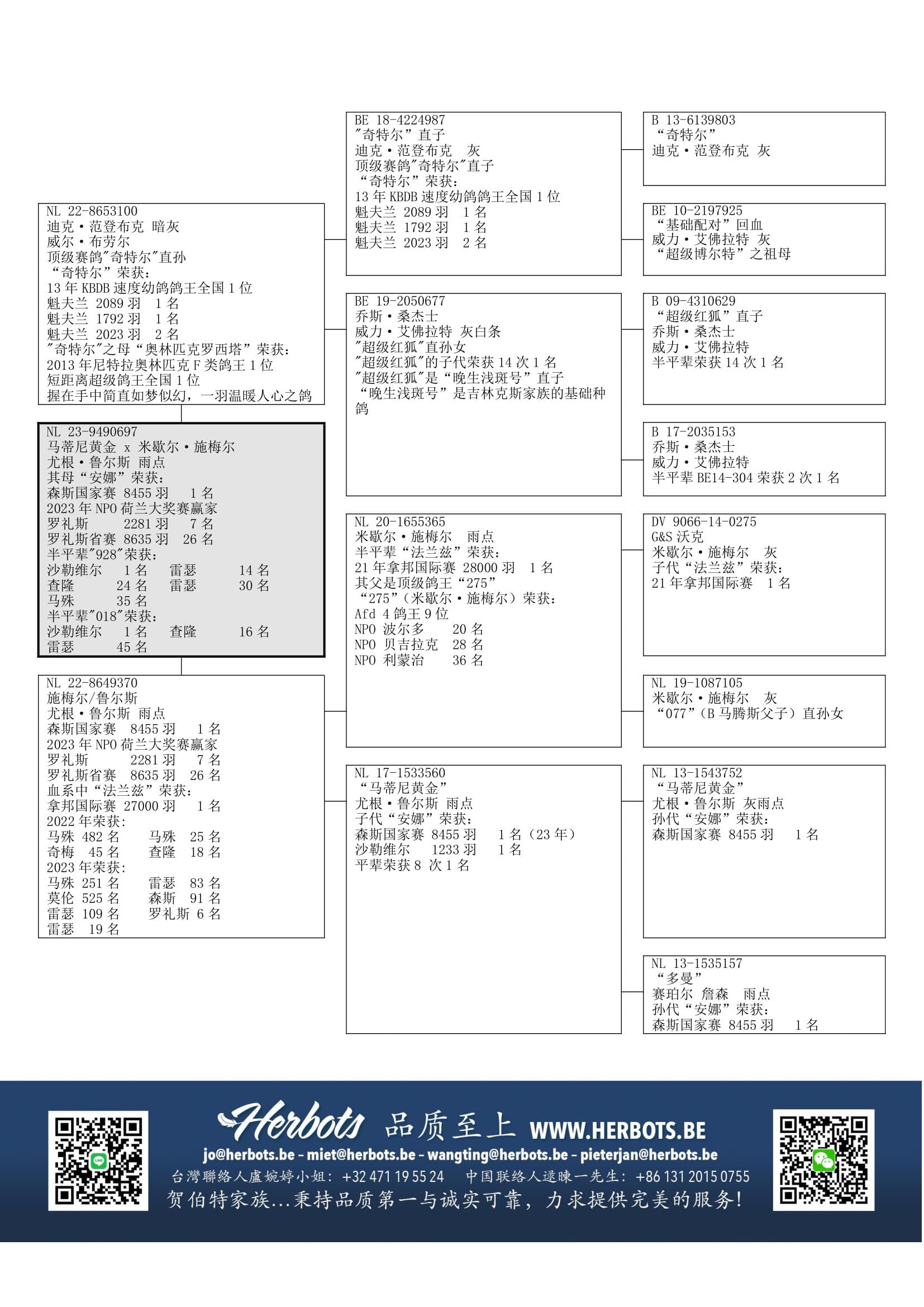 NL20-1655365” (拿邦国际赛 28,000羽1名之半兄弟) x “马蒂尼黄金” (子代荣获12次1名)作出