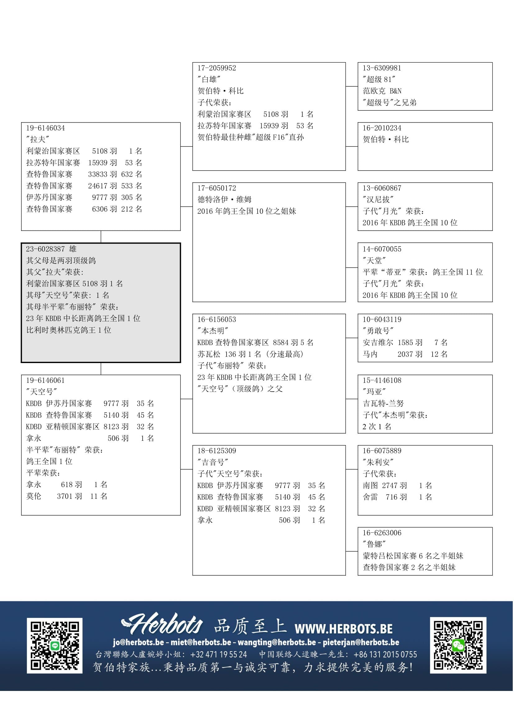 “白雄” (贺伯特·科比原舍 – 血系:“葛斯顿年轻号”和“F16”-范欧克) x “B17-6050172”(全平辈荣获KBDB中长距离鸽王全国10位 –德特洛伊·维姆)作出