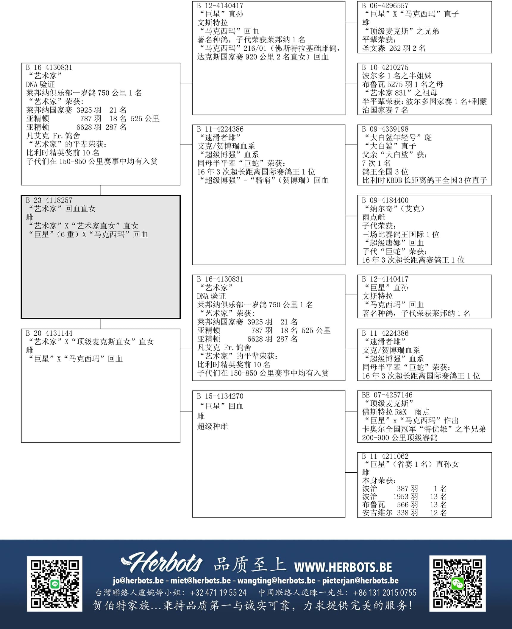 父亲: “艺术家” B23-4118257荣获: 莱邦纳国家赛 3,925羽21名 - 亚精顿 6,628羽287名“艺术家”的一羽全兄弟作出比利时精英公棚赛前10名-凡艾克 福雷迪血系:“巨星”