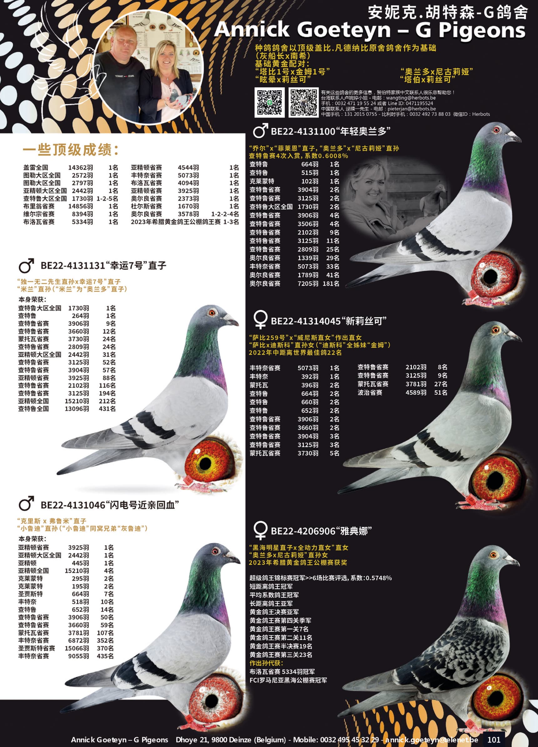 “黑海明星直子” (丹尼斯) x “全劲力直女” (出自“全劲力” (布鲁瓦省赛 5,334羽1名) x “奥兰迪纳” (奥尔良省赛 3,578羽2名 – 查特鲁国家赛区2名 - “奥兰多” x “尼克菲利亚”回血) 直女