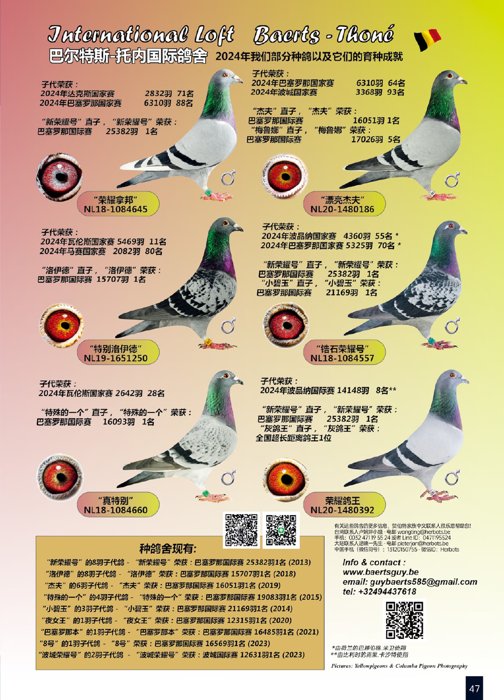 子孙代荣获: 阿让国家赛1名 (英国),欧洲鸽王1位