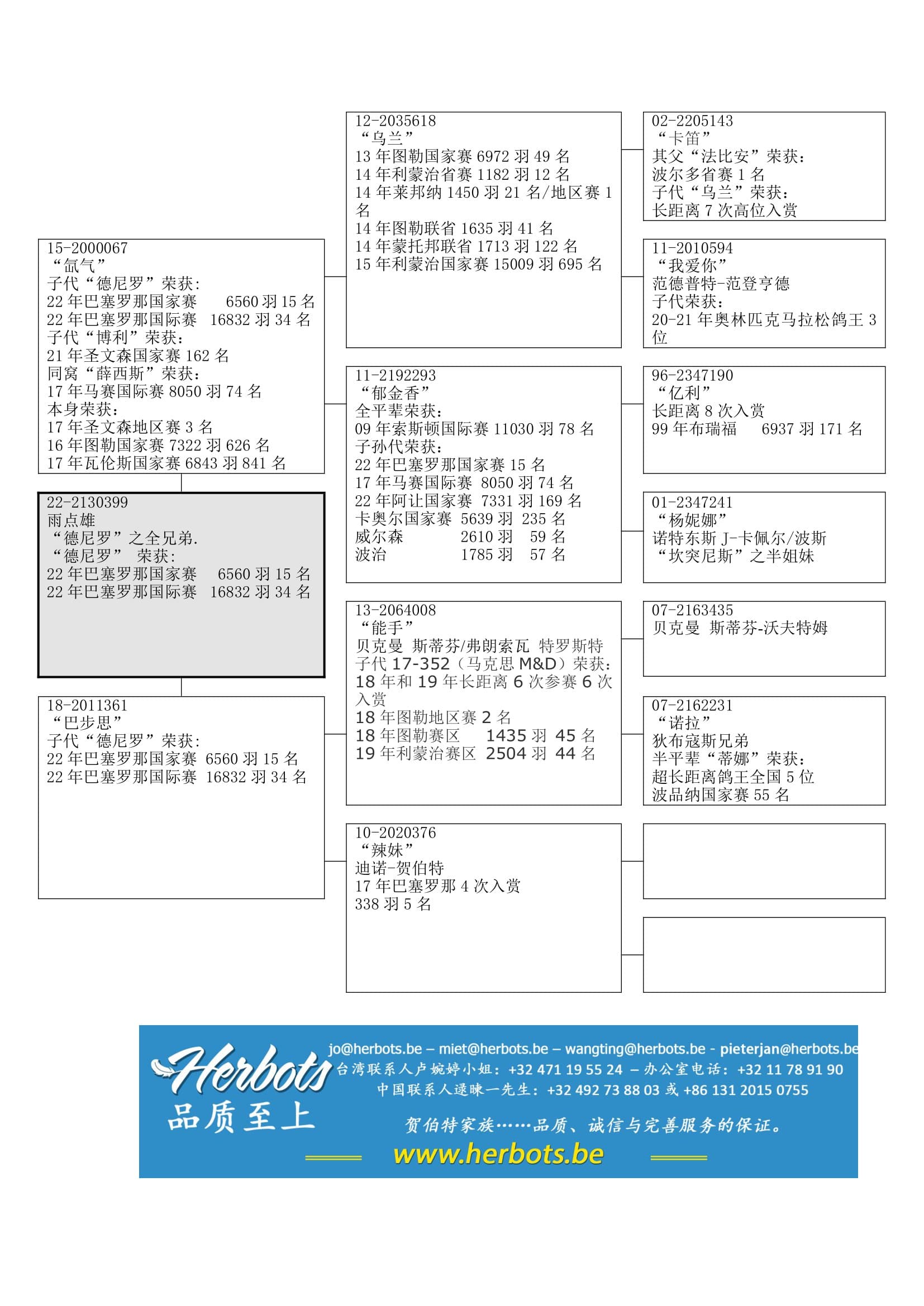 乌兰” (荣获:图勒 6,972羽49名 – 利蒙治省赛 1,182羽12名 – 图勒俱乐部1名/联省 1,635羽41名 – 等等) x “郁金香” (顶级种雌,作出多代顶级鸽 – 平辈荣获索斯顿 11,030羽78名)直子