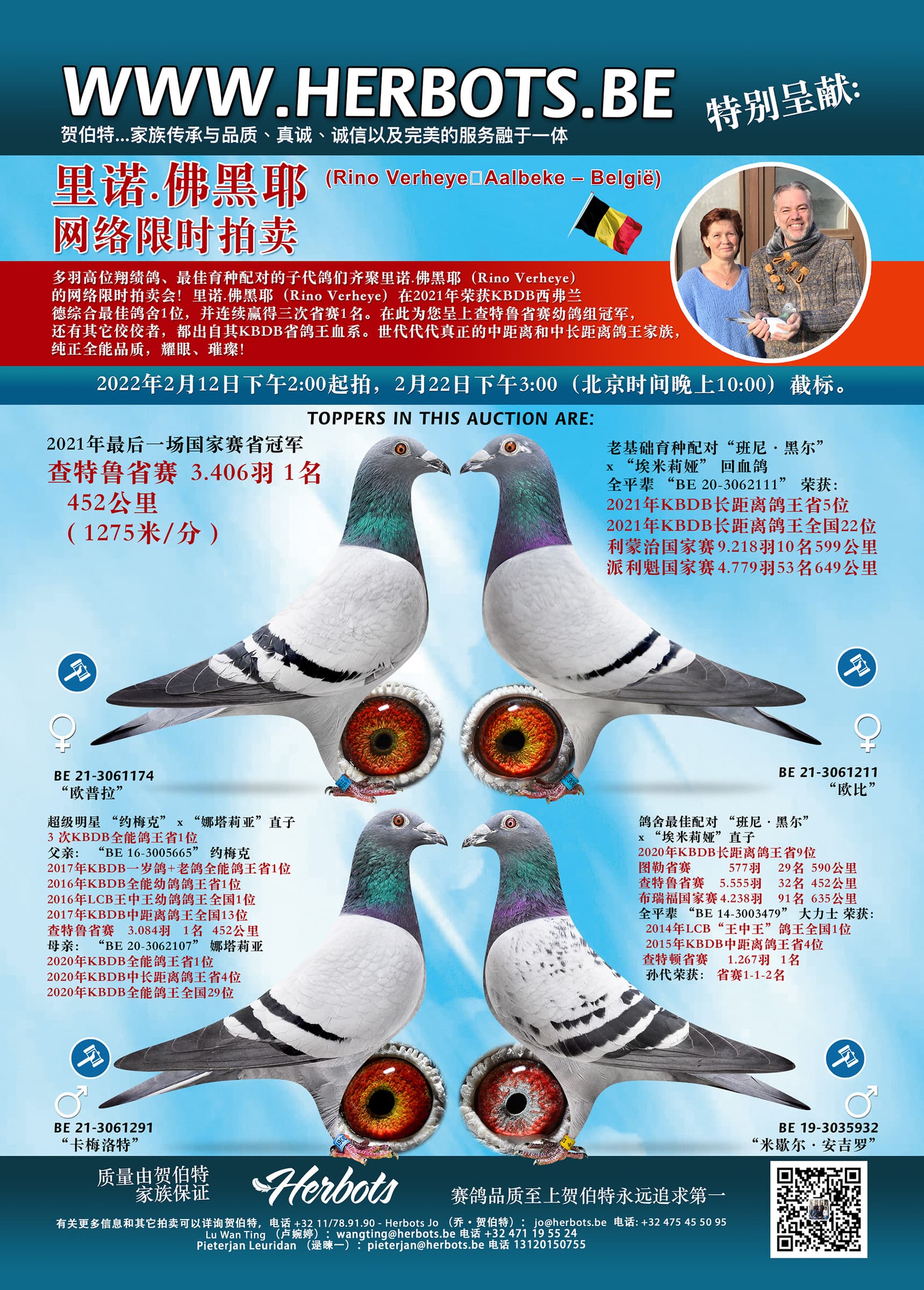 多羽高位翔绩鸽、最佳育种配对的子代鸽们齐聚里诺.佛黑耶(Rino Verheye)的网络限时拍卖会!里诺.佛黑耶(Rino Verheye)在2021年荣获KBDB西弗兰德综合最佳鸽舍1位,并连续赢得三次省赛1名。在此为您呈上查特鲁省赛幼鸽组冠军,还有其它佼佼者,都出自其KBDB省鸽王血系。世代代代真正的中距离和中长距离鸽王家族,纯正全能品质,耀眼、璀璨!