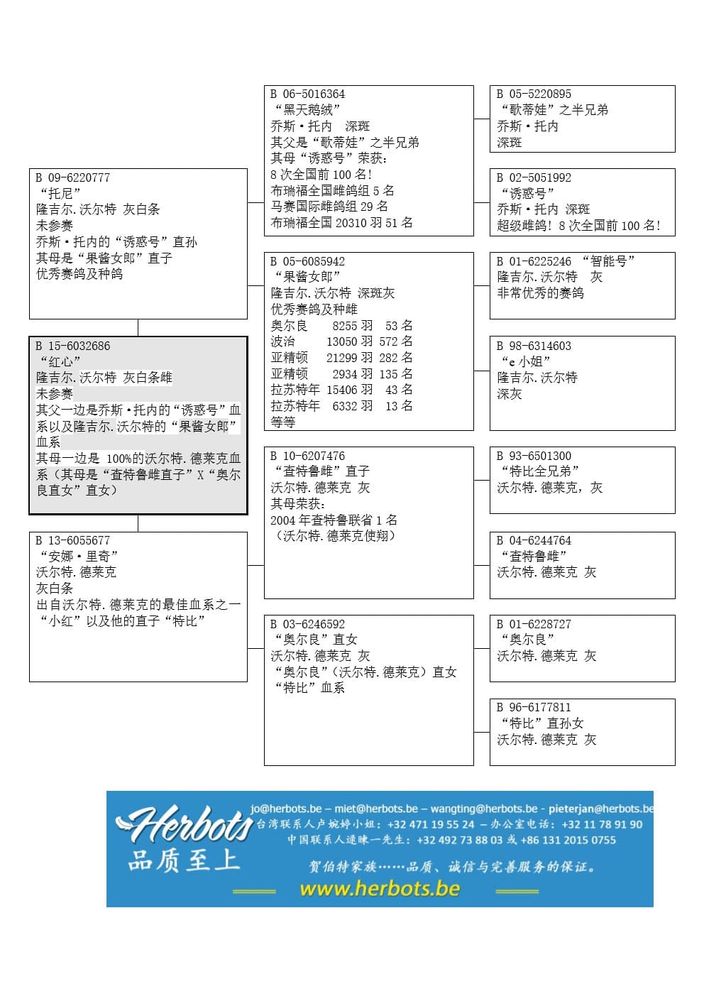 “黑天鹅绒” (托内原舍 – 其父是“歌蒂娃”之半兄弟 - “诱惑号”直子, “诱惑号”荣获8次全国前100名) x 顶级雌鸽“果酱女郎”作出