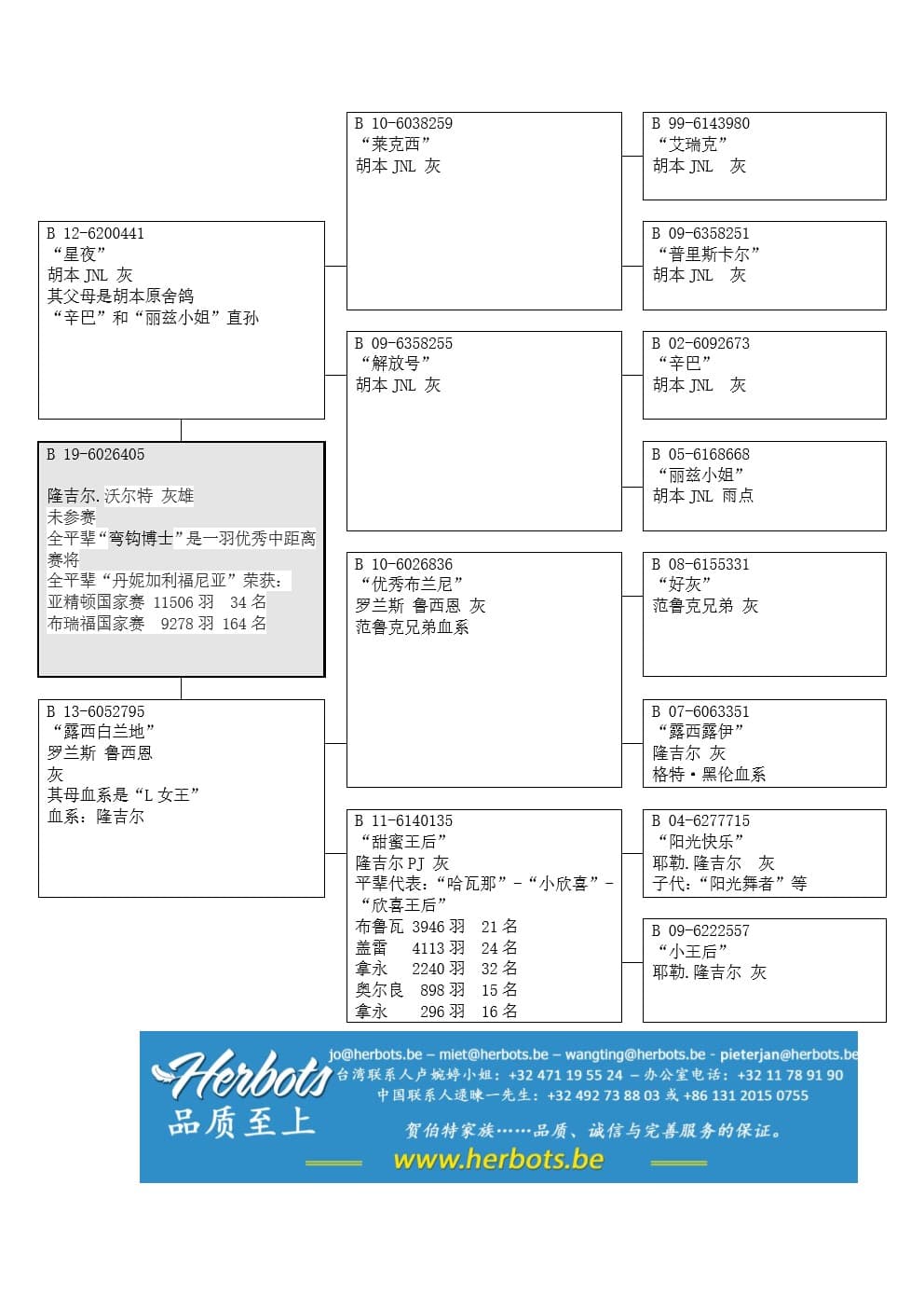 “优秀布兰尼” (鸽系: 范鲁克 x隆吉尔.耶勒) x “甜蜜王后” (荣获: 布鲁瓦 3,946羽21名 – 盖雷 4,113羽24名 – 拿永 2,240羽32名 – 奥尔良 898羽15名 – 拿永 296羽16名 - 隆吉尔.耶勒原舍 - 平辈代表:“哈瓦那”, “小欣喜”, “欣喜王后”) 作出