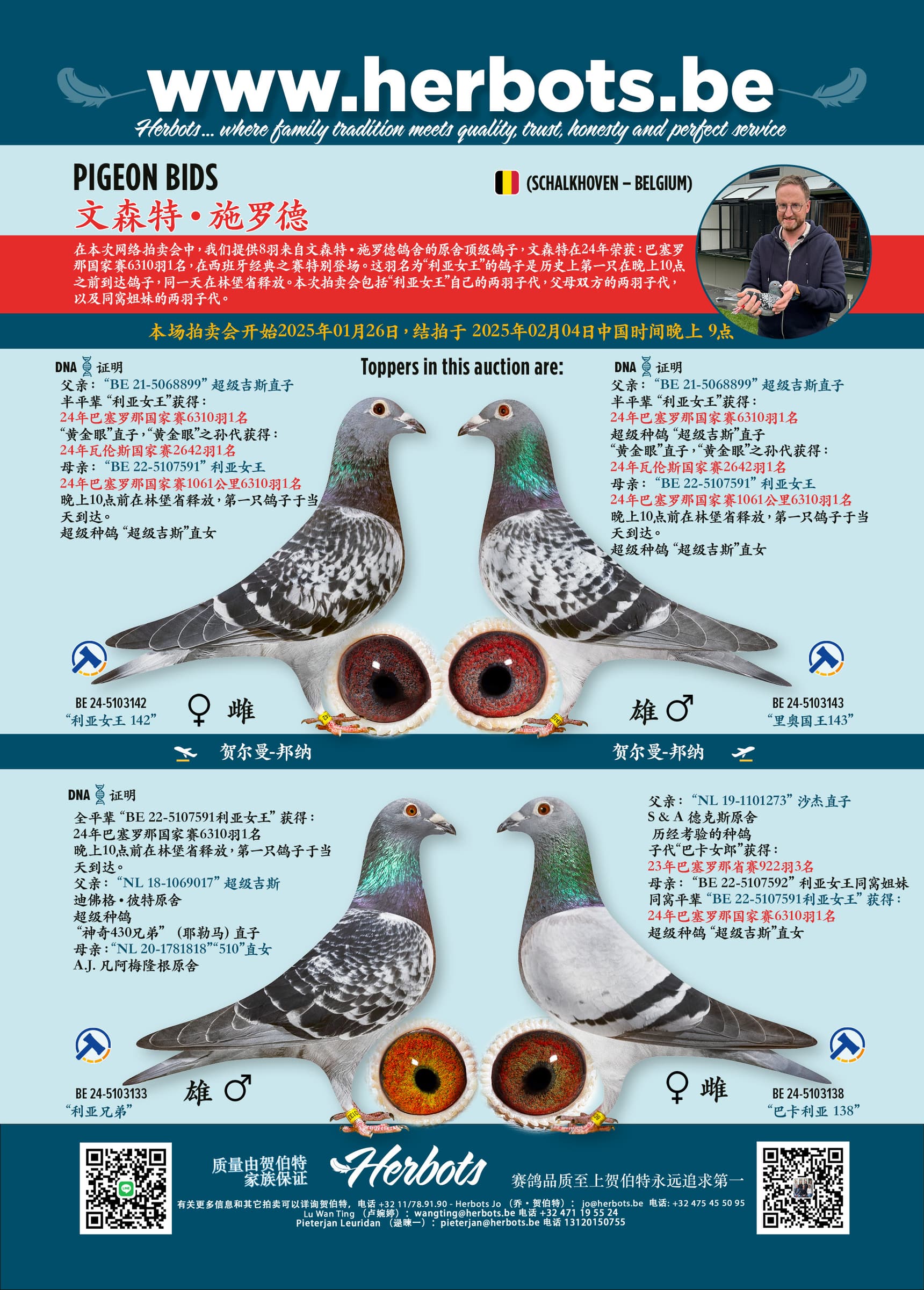 在这次网上拍卖中,我们提供来自文生·施罗德鸽群的 8 羽顶级鸽。文生在2024年西班牙经典赛中获得全国 6,310 羽冠军。这羽冠军鸽子“ 利亚女王”是第一只在放飞当天晚上 10 点之前在林堡省打钟的鸽子。