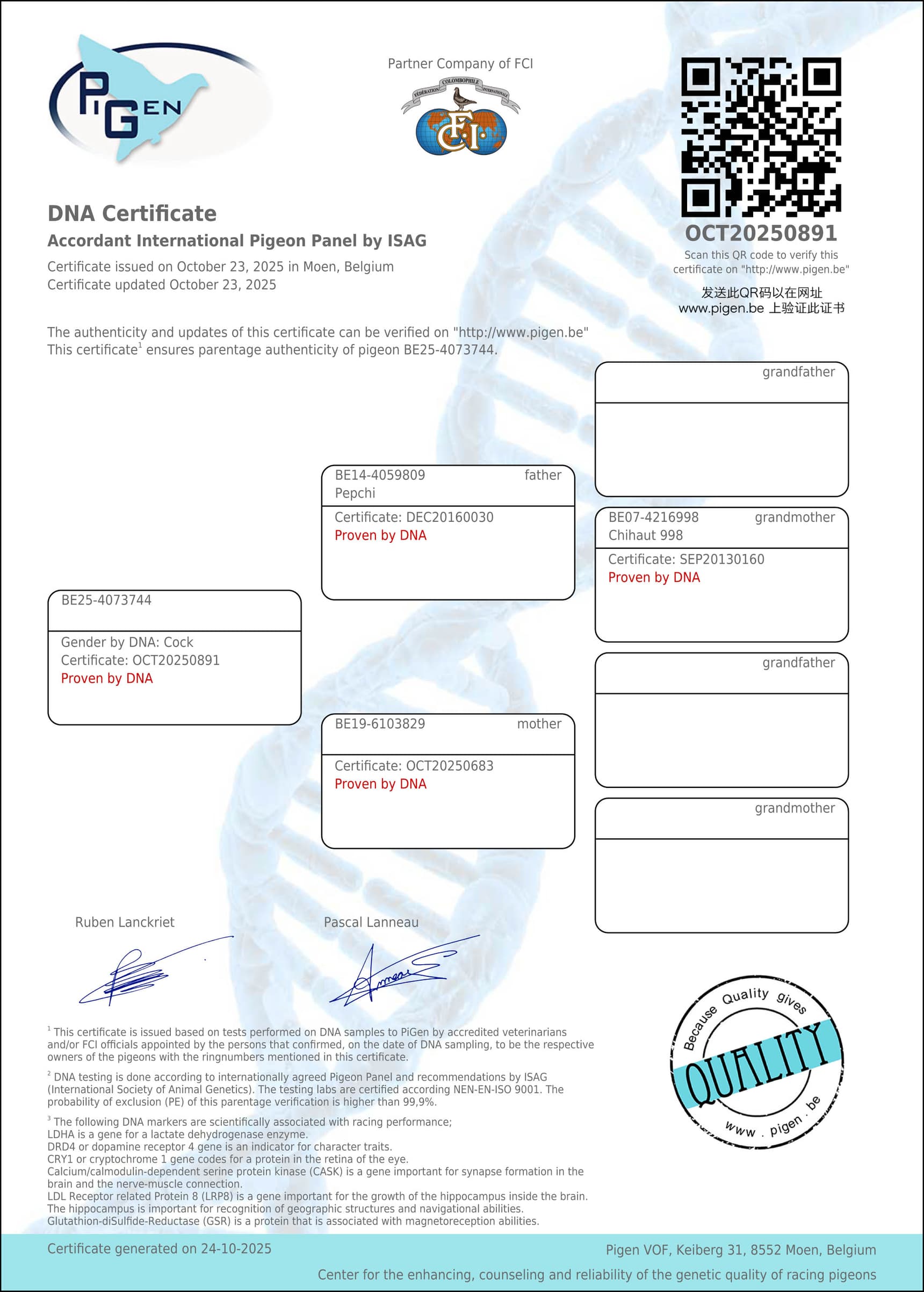 荣获: 2016年6场国家赛排名比利时最佳老鸽1位