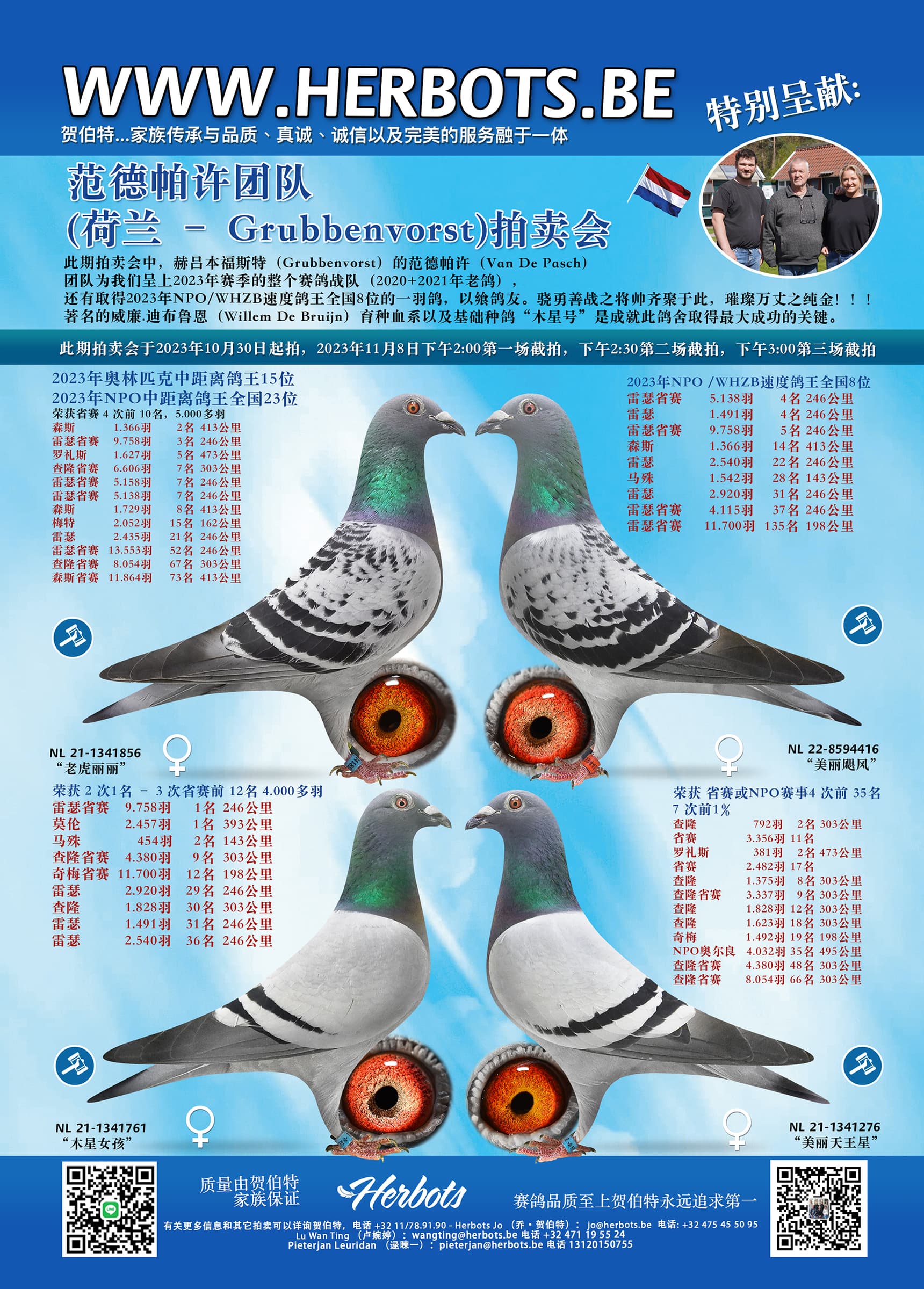 此期拍卖会中,赫吕本福斯特(Grubbenvorst)的范德帕许(Van De Pasch)团队为我们呈上2023年赛季的整个赛鸽战队(2020+2021年老鸽),