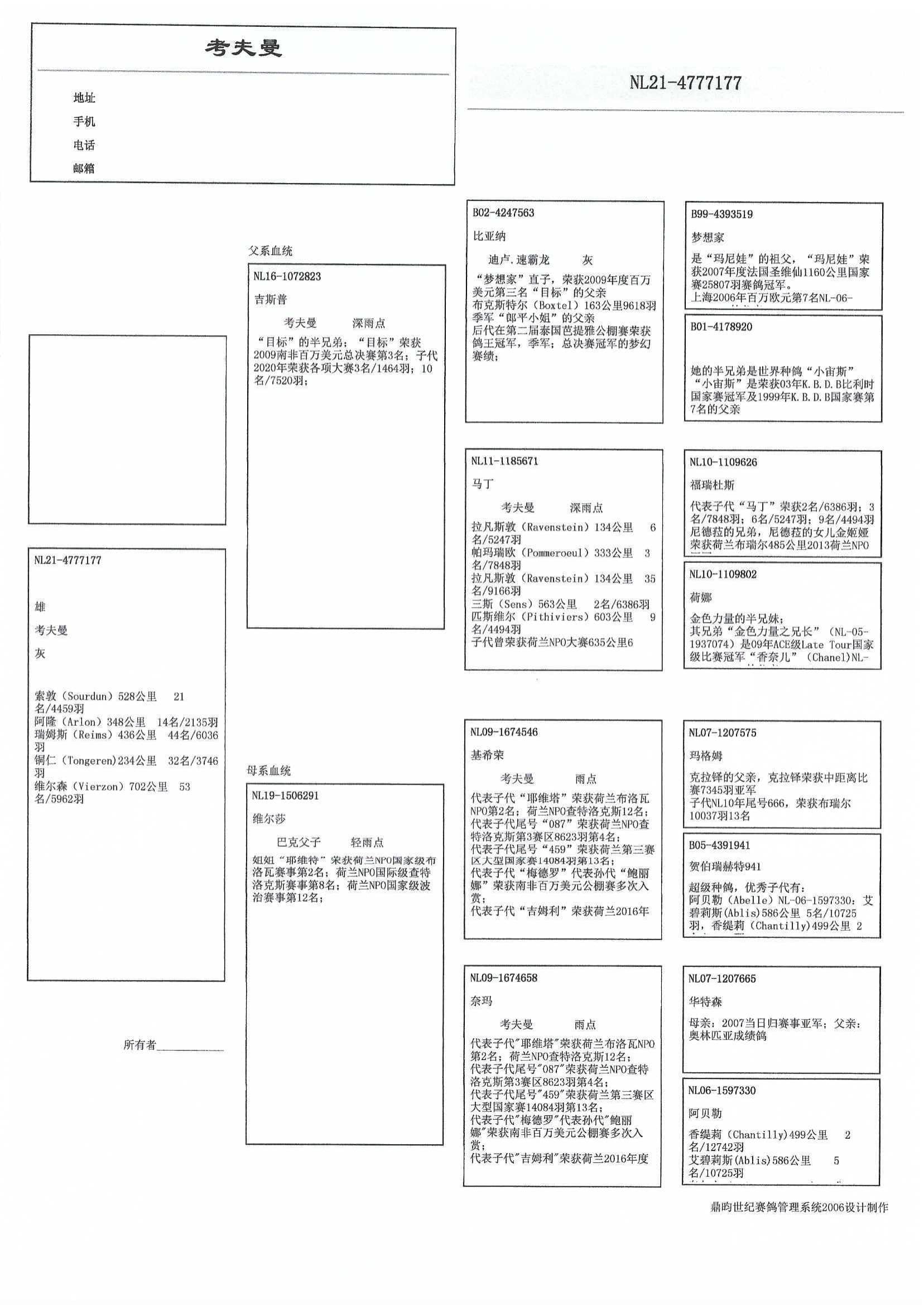 “比亚纳”之子(迪卢.速霸龙品系) x “NL11-1185671”(获得: 2名衫斯 6,386羽 – 3名 帕玛瑞欧 7,848羽 - 6名 瑞凡斯敦 5,247羽 – 9名 匹斯维尔4,494羽 )