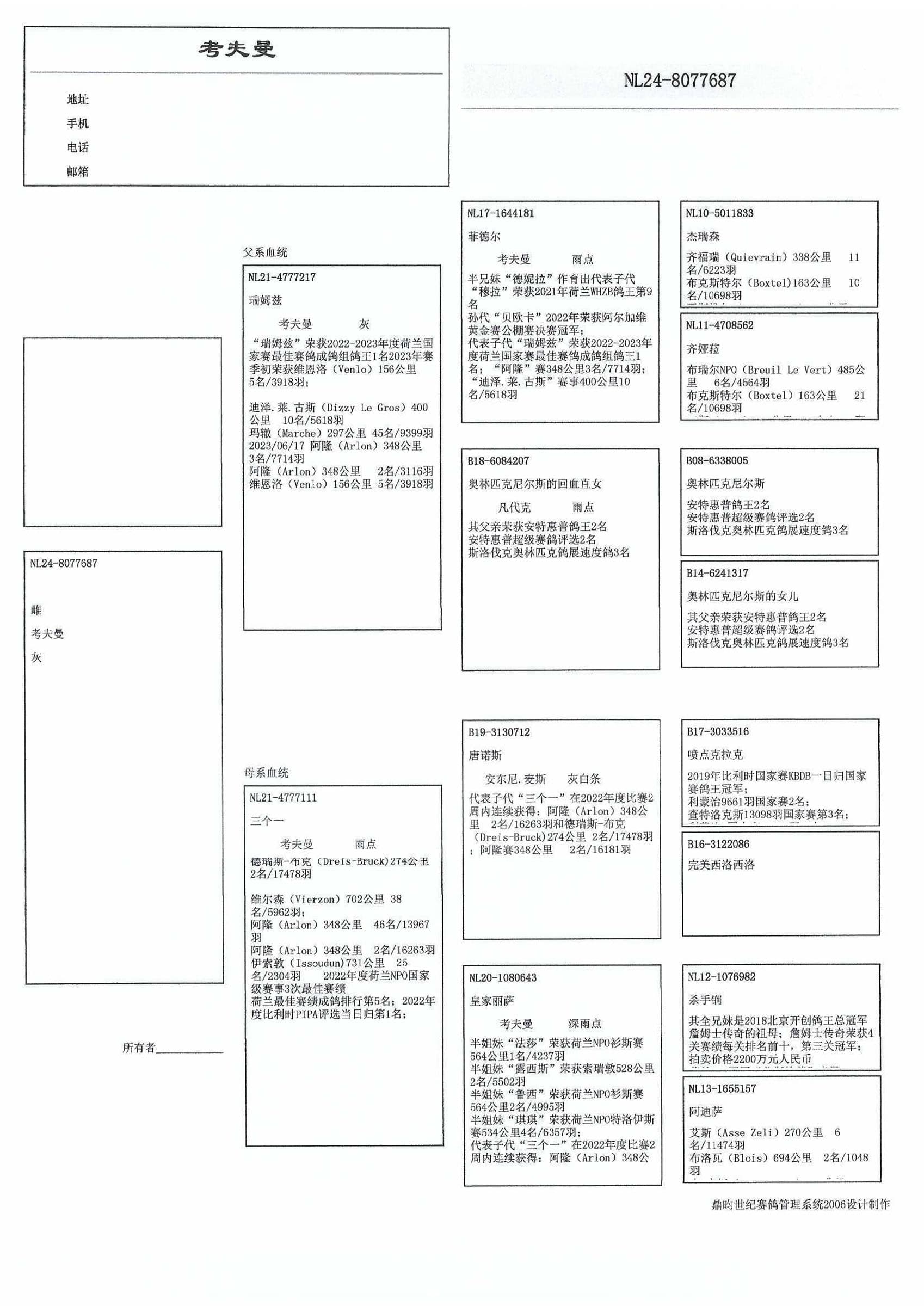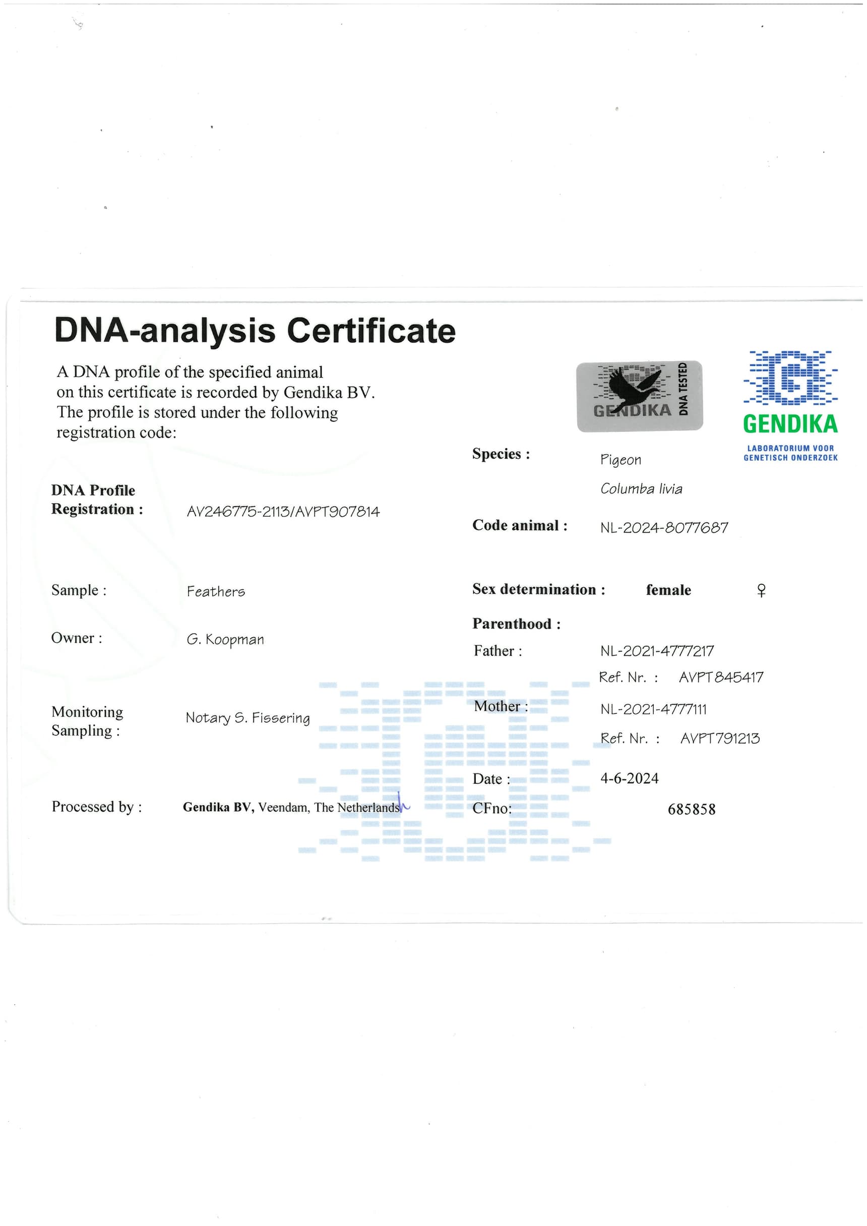 “唐诺斯” (出自 1名 全国鸽王 KBDB “喷点克拉克” x “完美 西洛西洛”) x “皇家丽萨”(与考夫曼原舍众多名鸽是半兄/妹“法莎”, “卡利斯托”, “播扎”, “朱诺拉” )
