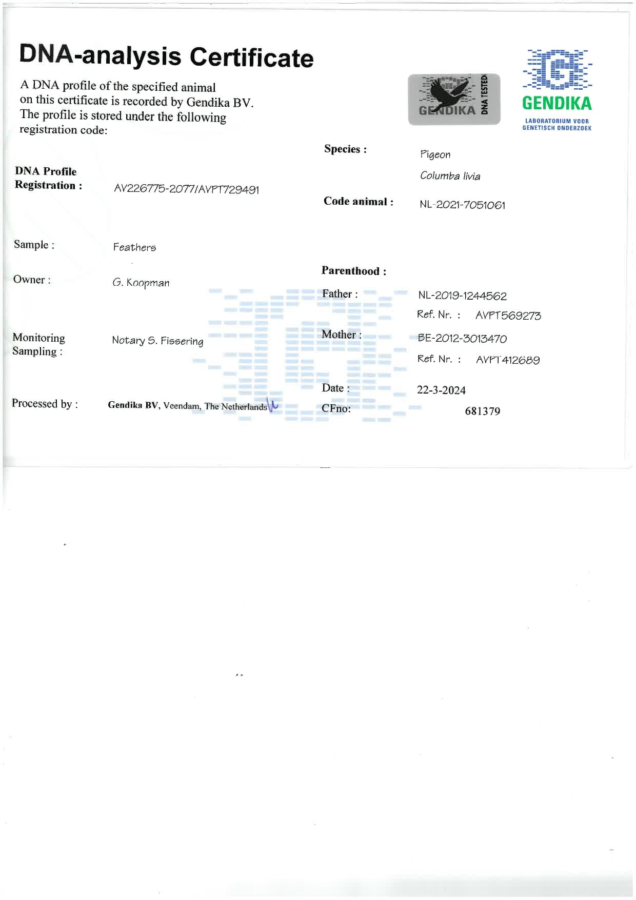 奥林匹克鸽“多特蒙德” x “利蒙治的半姐妹” (赢得 1名 图尔斯 332羽 – 2名查特鲁 5,991羽 和 半兄妹:1名 国家级 利蒙治)