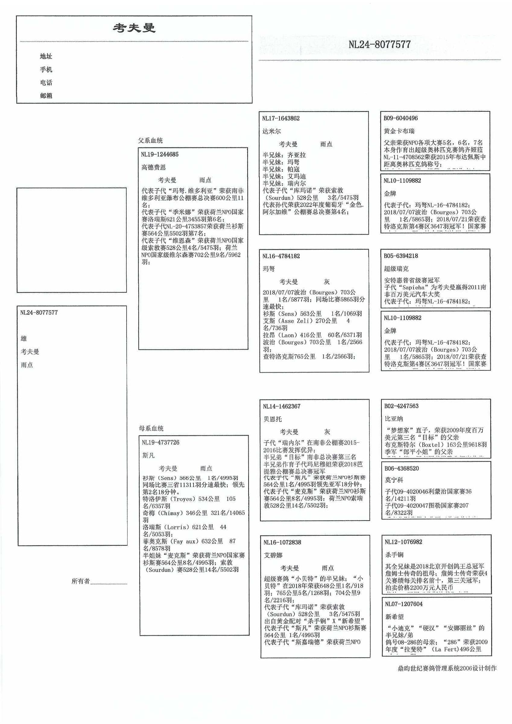 出自: “达米尔” (出自: “黄金卡布瑞” x“金牌”) x它的妹妹世界名鸽 “玛弩” (1名 NPO 赛区 4 查特鲁 3,647羽 - 最快19,192羽 – 1名 NPO 赛区 4 波治5,877羽 – 1名 衫斯 1,069羽)