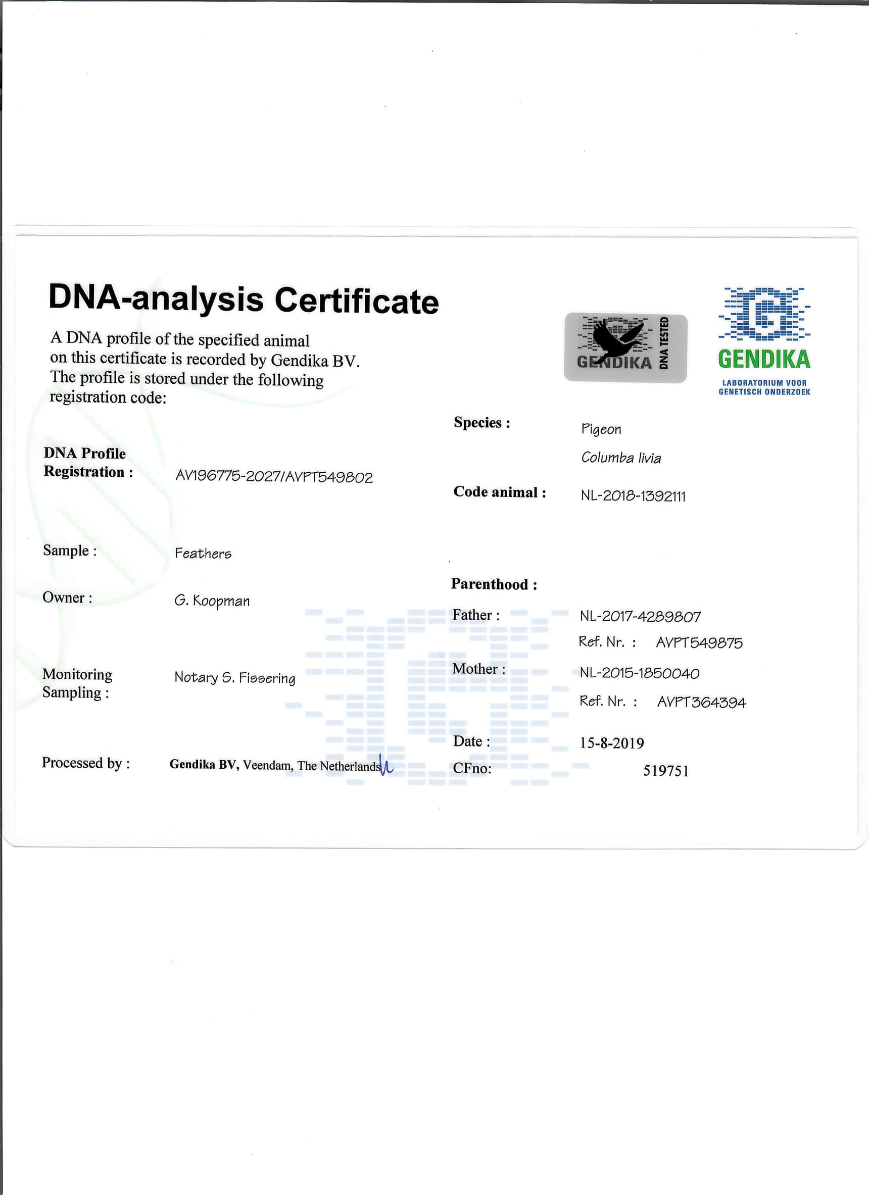 世界名鸽 “哈利” x “艾斯美” (1名  国家赛鸽王 ’14)