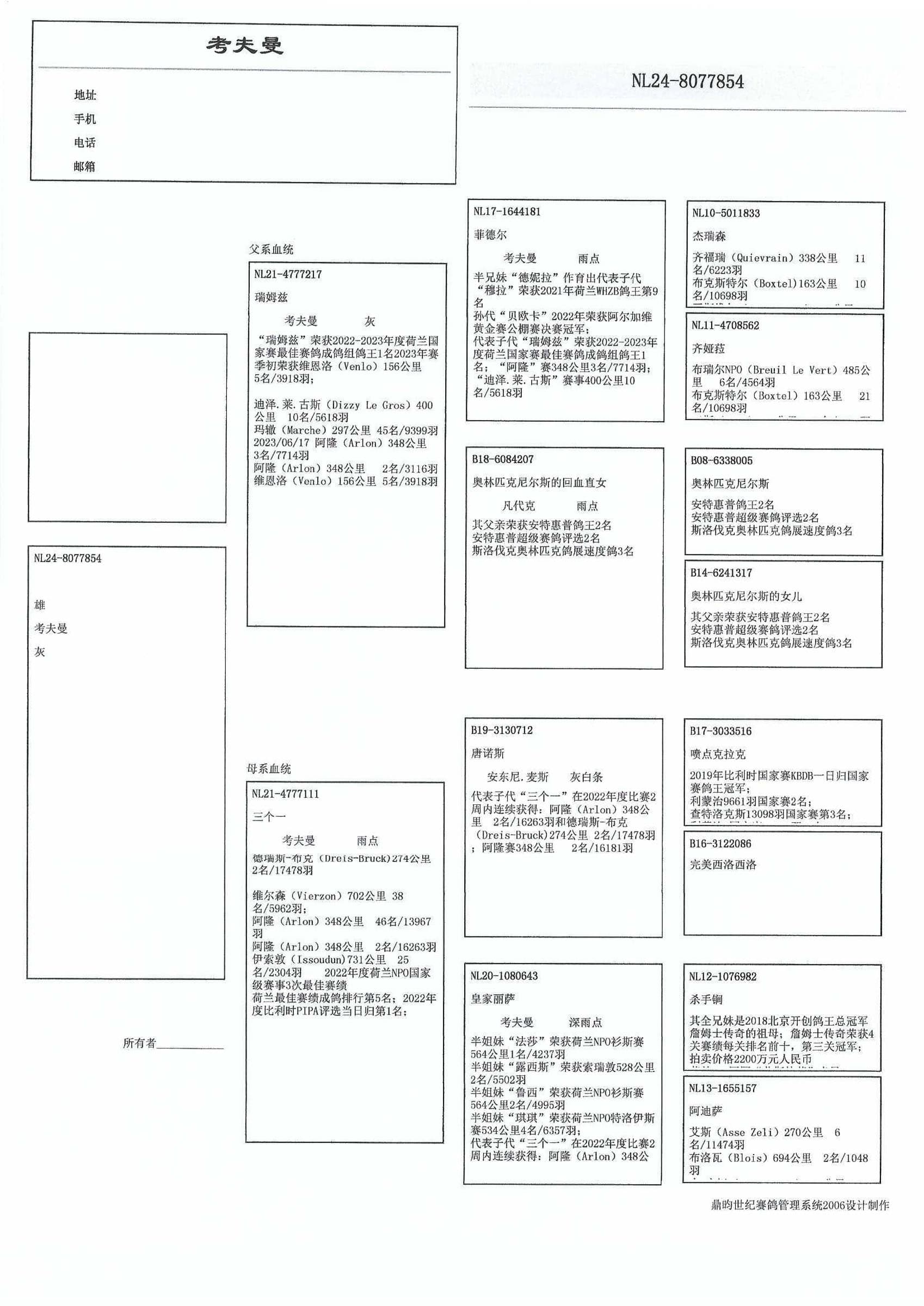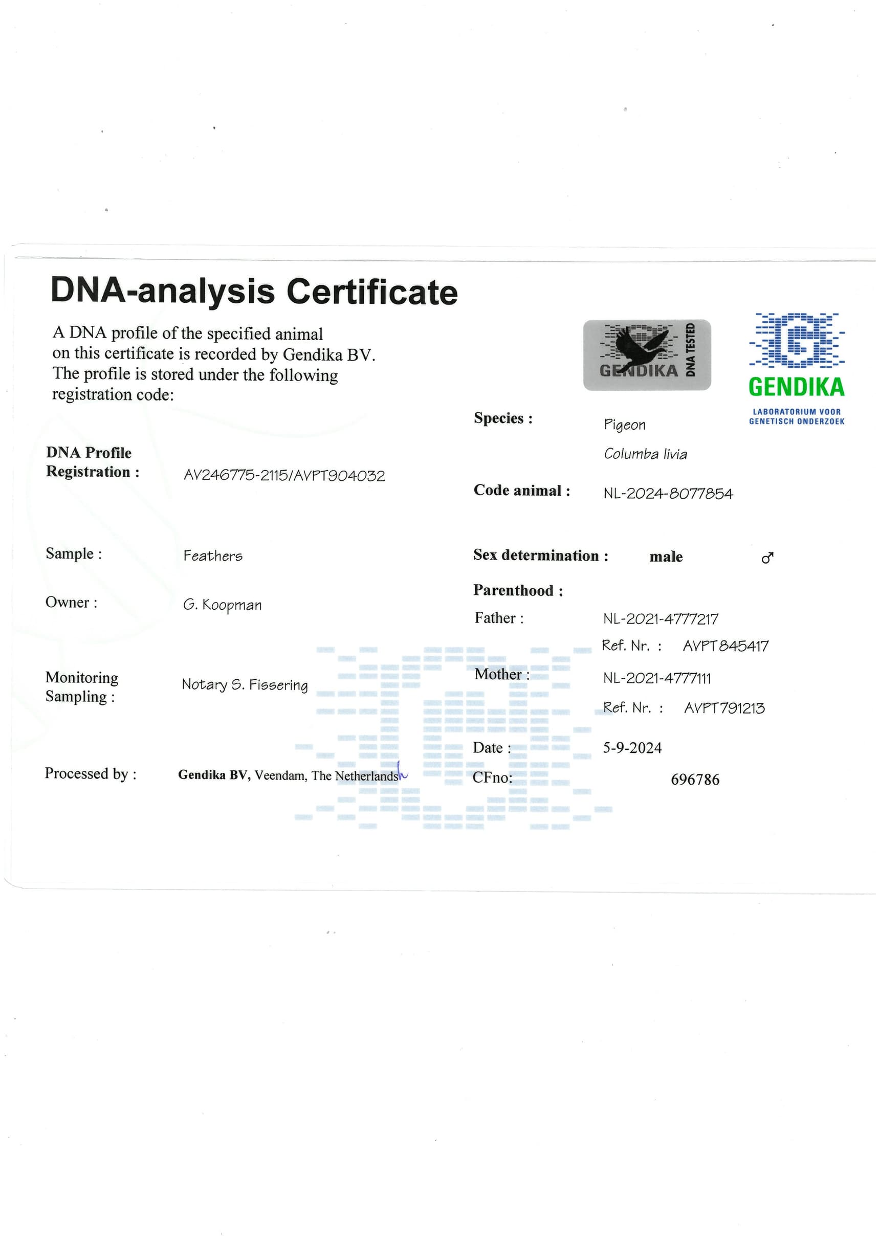 出自 “唐诺斯” (1名 全国 鸽王评选 KBDB “喷点.克拉克” x “完美.西洛西洛”) x “皇家丽萨”(考夫曼品系众多名鸽半兄/妹“法莎”, “卡利斯托”, “播扎”, “朱诺菈” )