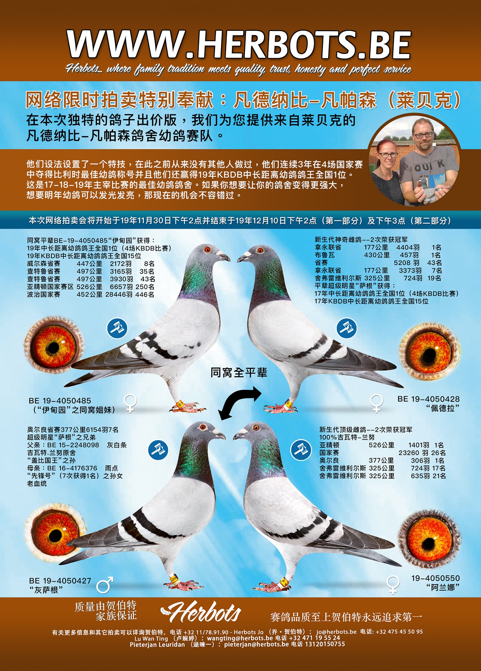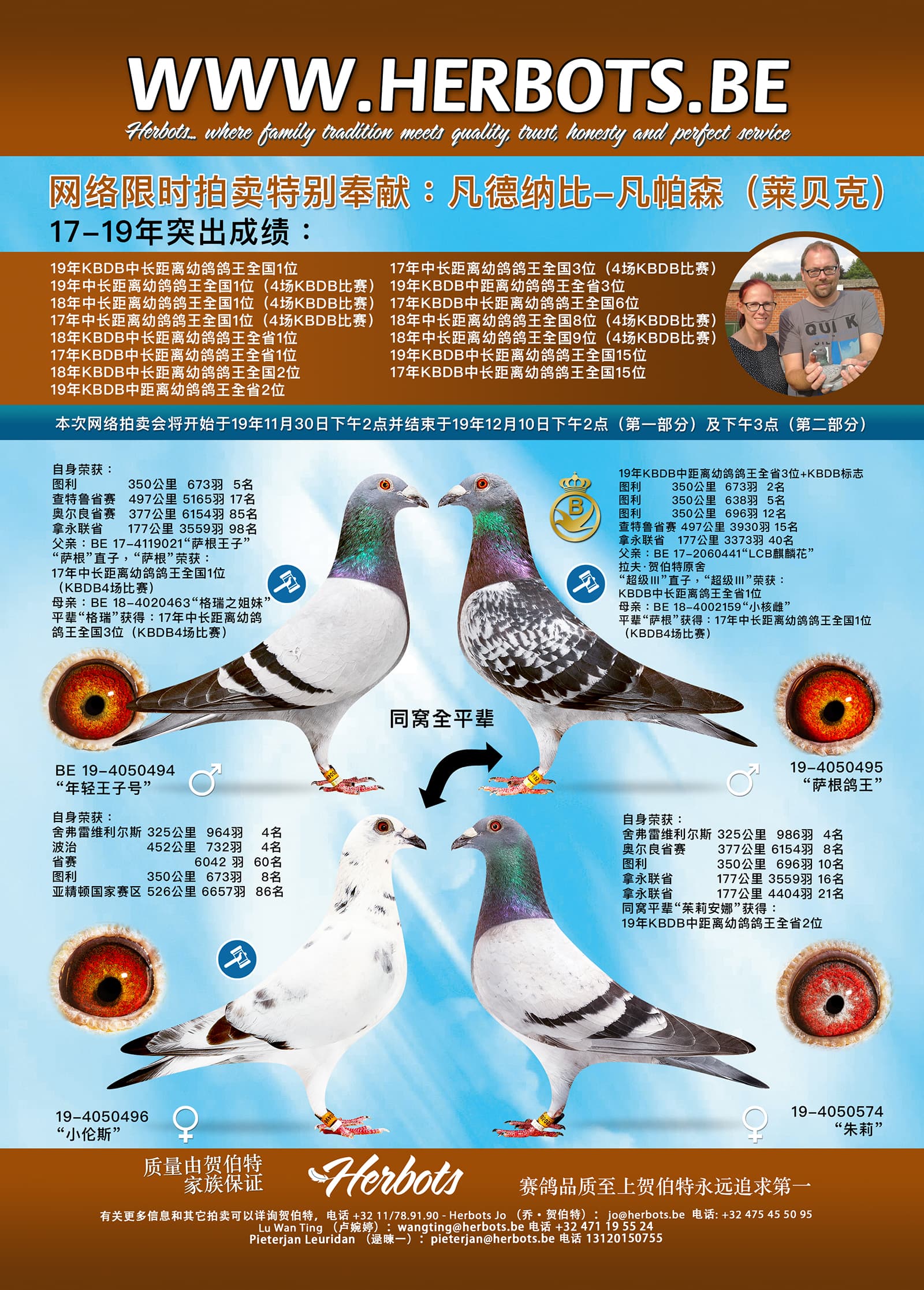 在本次独特的鸽子出价版,我们为您提供来自莱贝克的凡德纳比-凡帕森鸽舍幼鸽赛队。他们设法设置了一个特技,在此之前从来没有其他人做过,他们连续3年在4场国家赛中夺得比利时最佳幼鸽称号并且他们还赢得19年KBDB中长距离幼鸽鸽王全国1位。这是17-18-19年主宰比赛的最佳幼鸽鸽舍。如果你想要让你的鸽舍变得更强大,想要明年幼鸽可以发光发亮,那现在的机会不容错过。